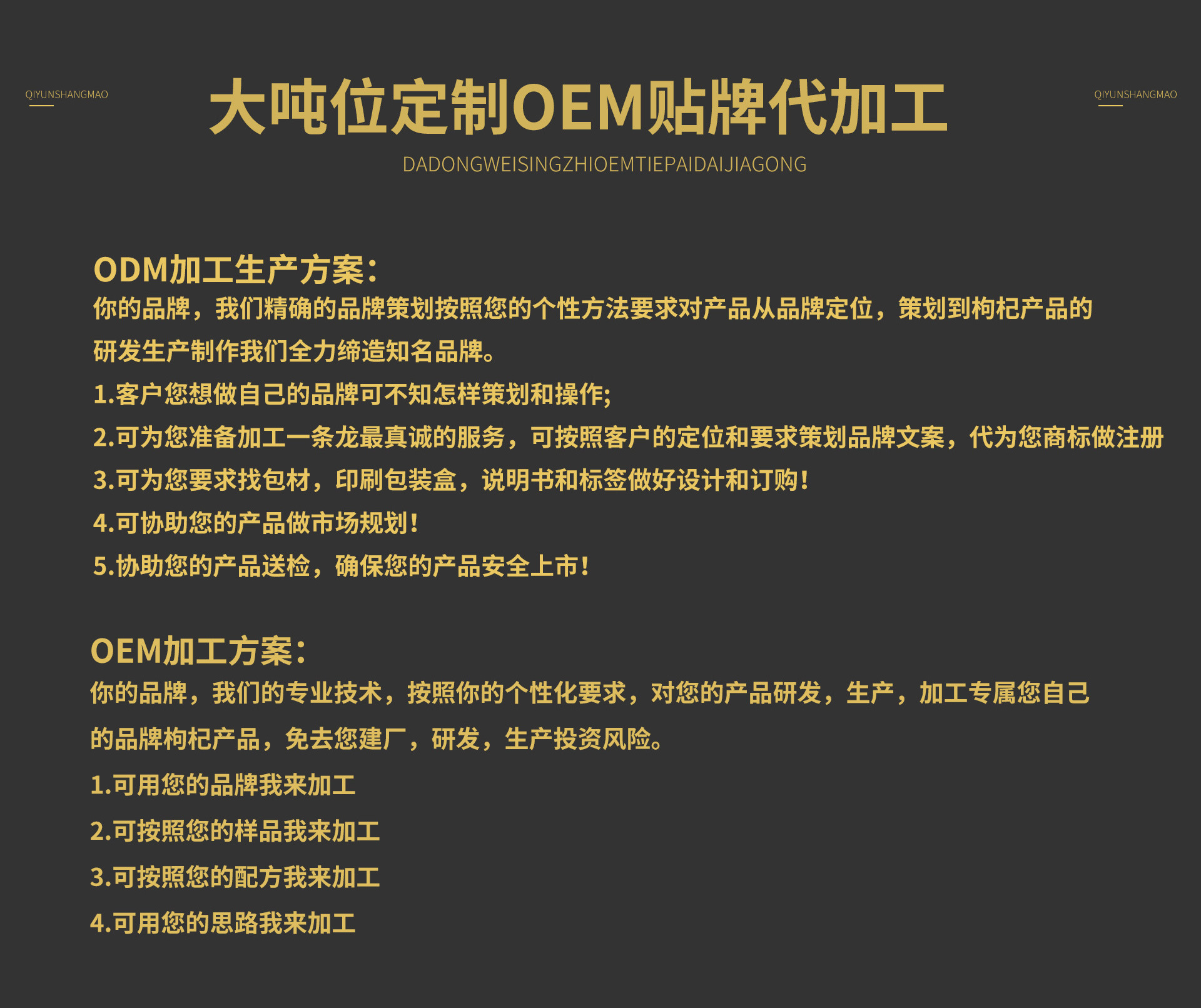 版權所有 代工幫 【www.cndrinks.cc】 CopyRight 2020-2025 豫網藥信備字[2025]00123號 電信與信息服務業務經營許可證:豫ICP備20017666號-3 鄭州代工幫網絡科技有限公司 公司地址:鄭州市金水區北環路與文化路瀚海北金B座7019室 聯系電話:0371-55621375 本站只起到信息平臺作用,不為交易經過負任何責任,請雙方謹慎交易,以確保您的權益 任何單位及個人不得發布欺騙性產品信息