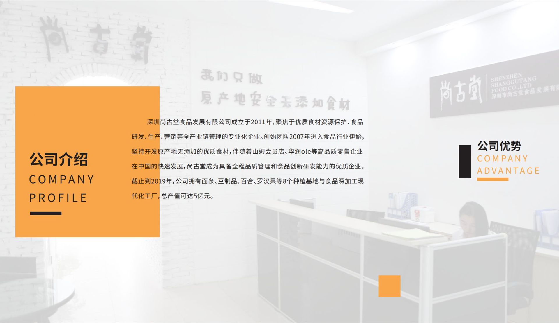 深圳尚古堂食品發(fā)展有限公司成立于2011年,是一家聚焦于優(yōu)質(zhì)食材資源保護、食品研發(fā)、生產(chǎn)、營 銷等全程產(chǎn)業(yè)鏈管理專業(yè)化企業(yè)。 創(chuàng)始團隊2007年進入食品行業(yè)伊始,就堅持開發(fā)原產(chǎn)地無添加的優(yōu)質(zhì)食材,伴隨著山姆會員店、華潤 ole等高品質(zhì)零售企業(yè)在中國的快速發(fā)展,尚古堂也成為具備全程品質(zhì)管理和食品創(chuàng)新研發(fā)能力的優(yōu)質(zhì)企業(yè)。 尚古堂強調(diào)保護優(yōu)質(zhì)資源、尚古堂專注中高端消費市場、尚古堂堅持科技為產(chǎn)業(yè)賦能,截止到2019年,公 司擁有面制品、豆制品、蘭州百合、羅漢果等8個種植基地與食品深加工現(xiàn)代化工廠,總產(chǎn)值可達5億元。 未來,尚古堂深耕資源、科技、管理和營銷四大核心能力,向領(lǐng)先的食品企業(yè)目標邁進,為消費者獲 得美味、營養(yǎng)與健康的食品持續(xù)創(chuàng)造價值。