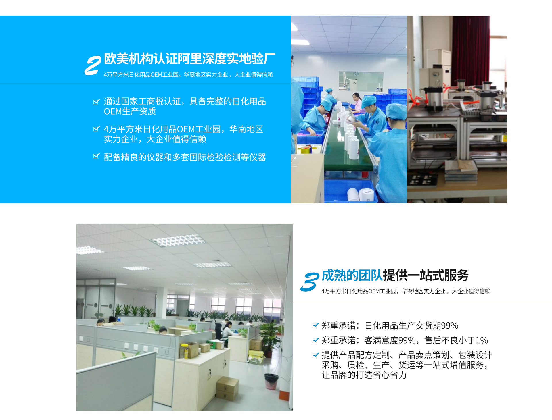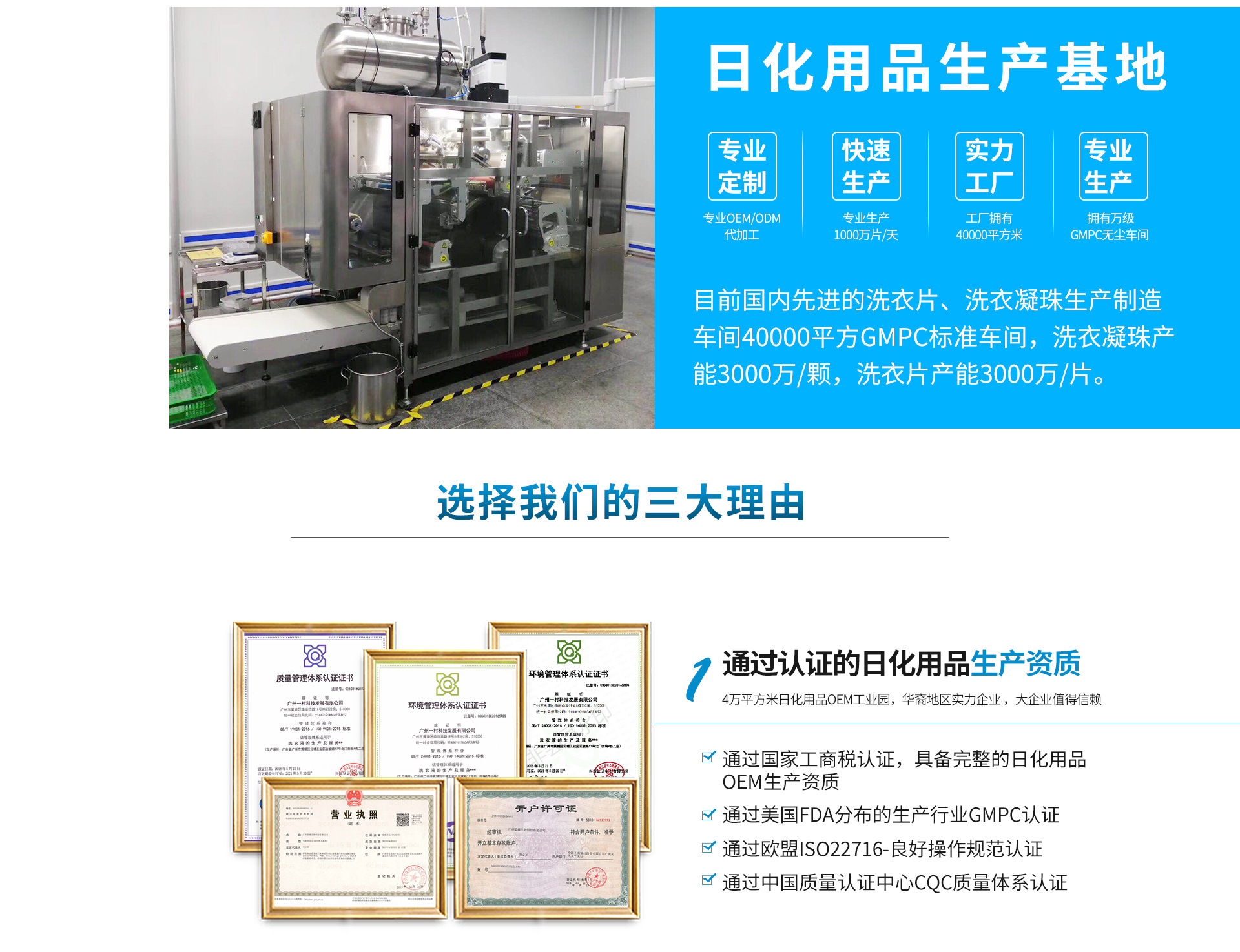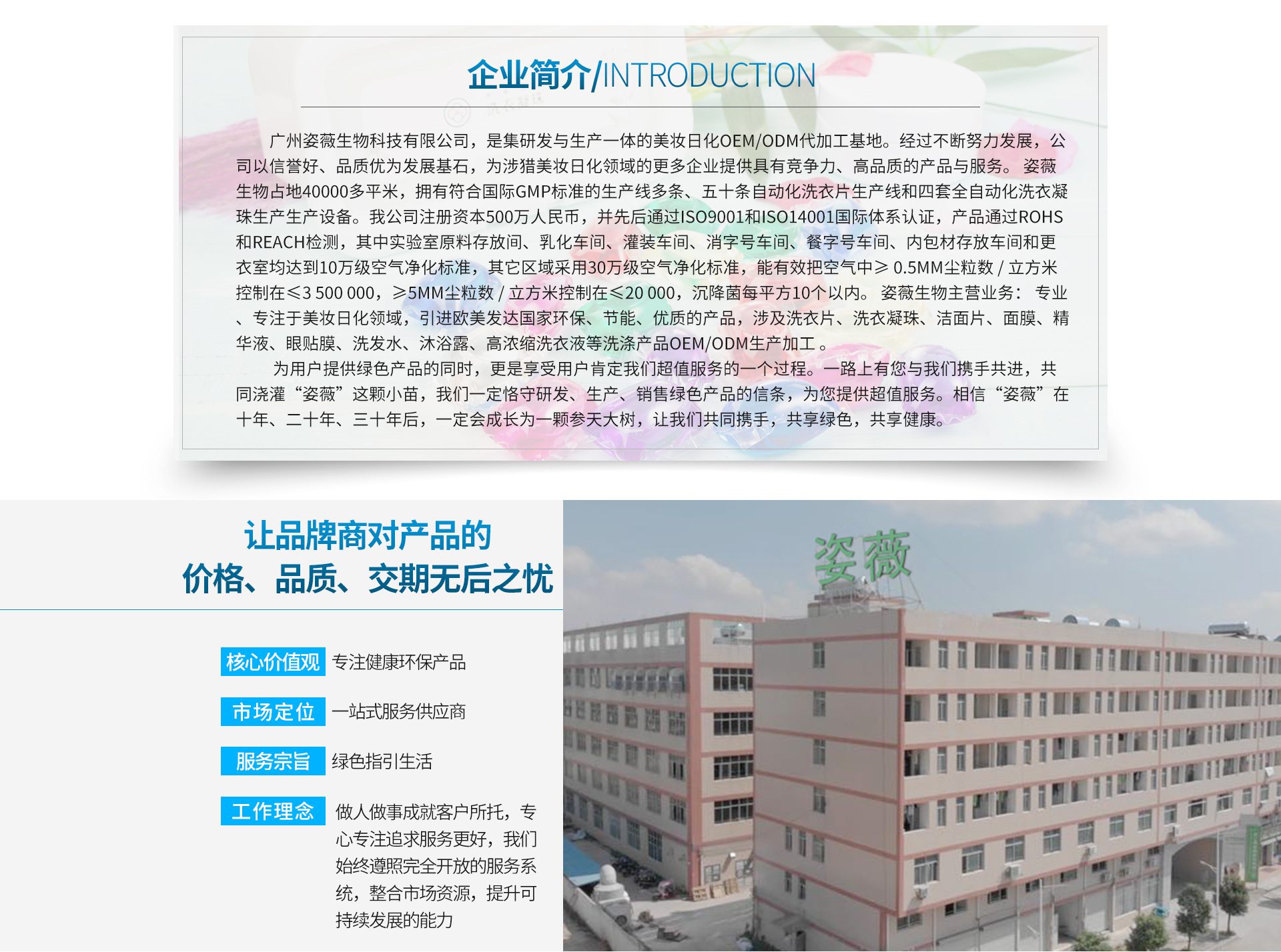 廣州姿薇生物科技有限公司,是集研發與生產一體的美妝日化OEM/ODM代加工基地。經過不斷努力發展,公司以信譽好、品質優為發展基石,美妝日化領域的更多企業提供具有競爭力、高品質的產品與服務。 伊萊生物占地10000多平米,擁有符合國際GMP標準的生產線多條、六套全自動化洗衣凝珠生產生產設備。我公司注冊資本600萬人民幣,并先后通過ISO9001和ISO14001國際體系認證,產品通過ROHS和REACH檢測,其中實驗室原料存放間、乳化車間、灌裝車間、消字號車間、餐字號車間、內包材存放車間和更衣室均達到10萬級空氣凈化標準,其它區域采用30萬級空氣凈化標準,能有效把空氣中≥ 0.5μm塵粒數 / 立方米控制在≤3 500 000,≥5μm塵粒數 / 立方米控制在≤20 000,沉降菌每平方10個以內。 伊萊生物主營業務: 專業、專注于美妝日化領域,引進歐美發達國家環保、節能、優質的產品,