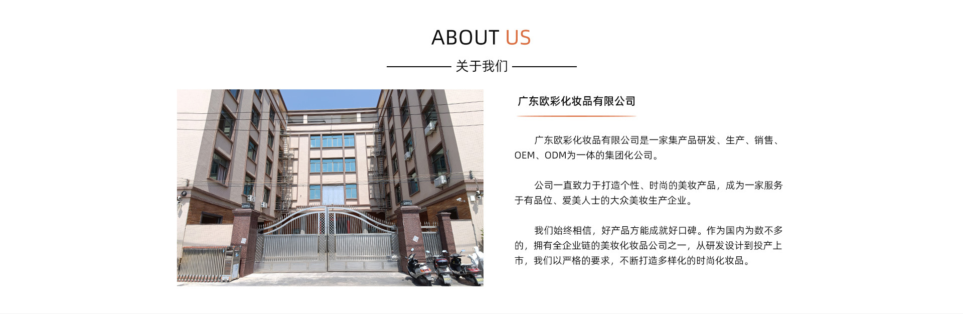 廣東歐彩化妝品有限公司OEM/ODM一站式服務企業 廣東歐彩化妝品有限公司是研發為核心,集策劃、生產、銷售為一體的綜 合性高科技化妝品OEM公司,為眾多知名品牌提供化妝品加工服務。 厚積薄發,成就雄厚實力 廣東歐彩化妝品有限公司生產基地有12000余平方米,工廠先后通過國際化標準GMPC認 證和ISO9001質量管理體系認證,擁有先進的生產設備和國內一流的生產環境,生產車間全 部采用十萬級空氣凈化消毒系統,創造良好的生產環境。 品質卓越,深受客戶好評 有美·廣州承純天然功效配方及精良的制作工藝,致力于為眾品牌商、美 容連鎖機構、網絡營銷機構、美容儀器開發商提供高效、新穎、獨特、尖端的綠色環保系產 品;涉及護膚、養膚、養生、美容、保健等領域;隨時掌握市場信息,將最新科技成果應用 到產品開發中。獨立開發、更新特色化妝品,為廣大客戶提供功效卓越,源自天然,品質過 硬的各種美容護膚產品。