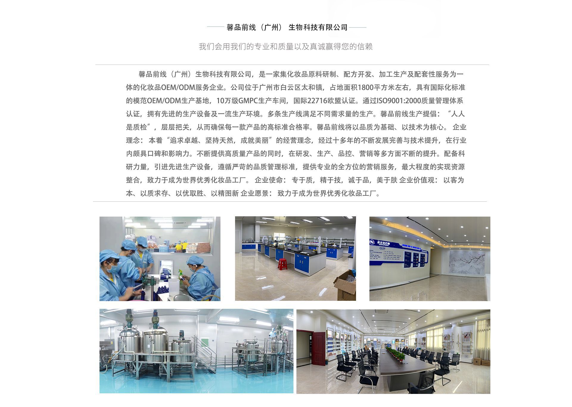 馨品前線(廣州)生物科技有限公司,是一家集化妝品原料研制、配方開發、加工生產及配套性服務為一體的化妝品OEM/ODM服務企業。公司位于廣州市白云區太和鎮,占地面積1800平方米左右,具有國際化標準的模范OEM/ODM生產基地,10萬級GMPC生產車間,國際22716歐盟認證。通過ISO9001:2000質量管理體系認證,擁有先進的生產設備及一流生產環境。多條生產線滿足不同需求量的生產。馨品前線生產提倡:“人人是質檢”,層層把關,從而確保每一款產品的高標準合格率。馨品前線將以品質為基礎、以技術為核心。企業理念: 本著“追求卓越、堅持天然,成就美麗”的經營理念,經過十多年的不斷發展完善與技術提升,在行業內頗具口碑和影響力。不斷提供高質量產品的同時,在研發、生產、品控、營銷等多方面不斷的提升。配備科研力量,引進先進生產設備,遵循嚴苛的品質管理標準,提供專業的全方位的營銷服務,最大程度的實現資源整合,致力于成為世界優秀化妝品工廠。 企業使命:專于質,精于技,誠于品,美于膚 企業價值觀: 以客為本、以質求存、以優取勝、以精圖新 企業愿景: 致力于成為世界優秀化妝品工廠。