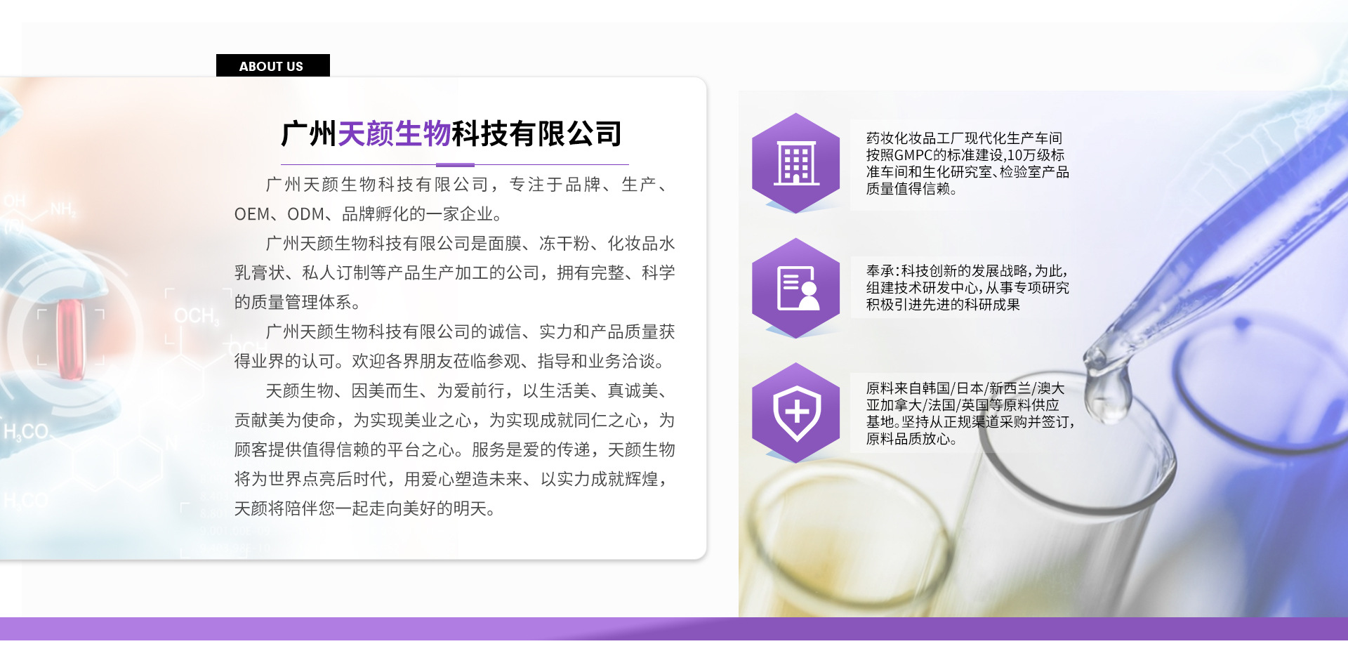 廣州天顏生物科技有限公司,是“蓓蘭國際集團”旗下,專注于品牌、生產、OEM、ODM、品牌孵化、教育培訓為一體的集團化運營企業。