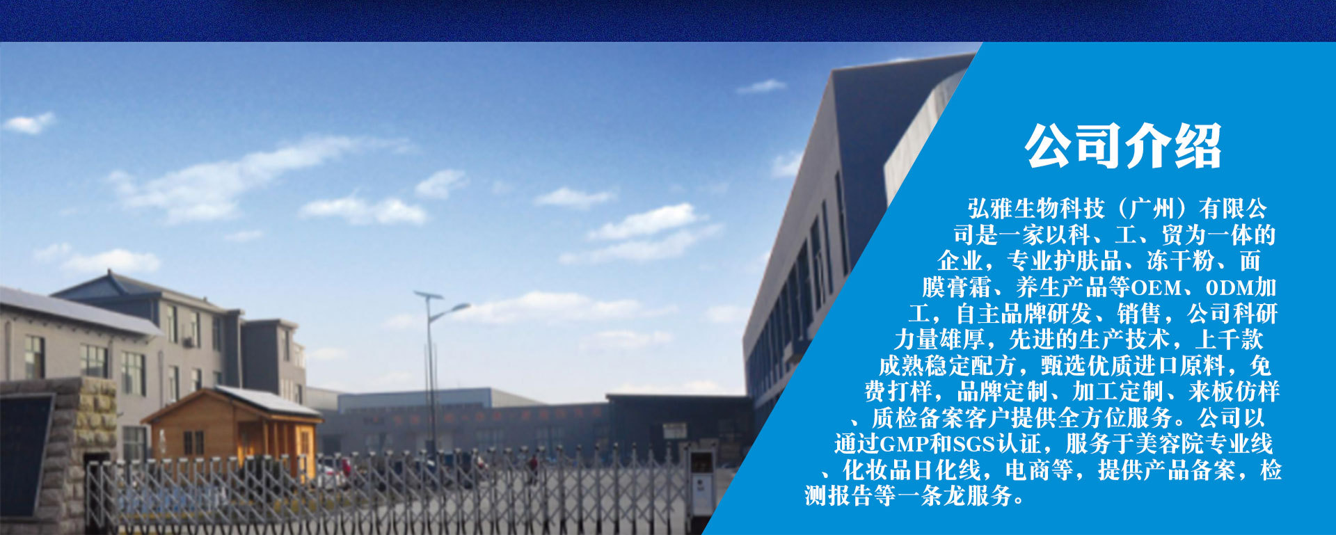 弘雅生物科技(廣州)有限公司是一家以科、工、貿(mào)為一體的企業(yè),專業(yè)護(hù)膚品、凍干粉、面膜膏霜、養(yǎng)生產(chǎn)品等OEM、ODM加工,自主品牌研發(fā)、銷售,公司科研力量雄厚,先進(jìn)的生產(chǎn)技術(shù),上千款成熟穩(wěn)定配方,甄選優(yōu)質(zhì)進(jìn)口原料,免費(fèi)打樣,品牌定制、加工定制、來板仿樣、質(zhì)檢備案客戶提供全方位服務(wù)。公司以通過GMP和SGS認(rèn)證,服務(wù)于美容院專業(yè)線、化妝品日化線,電商等,提供產(chǎn)品備案,檢測報告等一條龍服務(wù)。