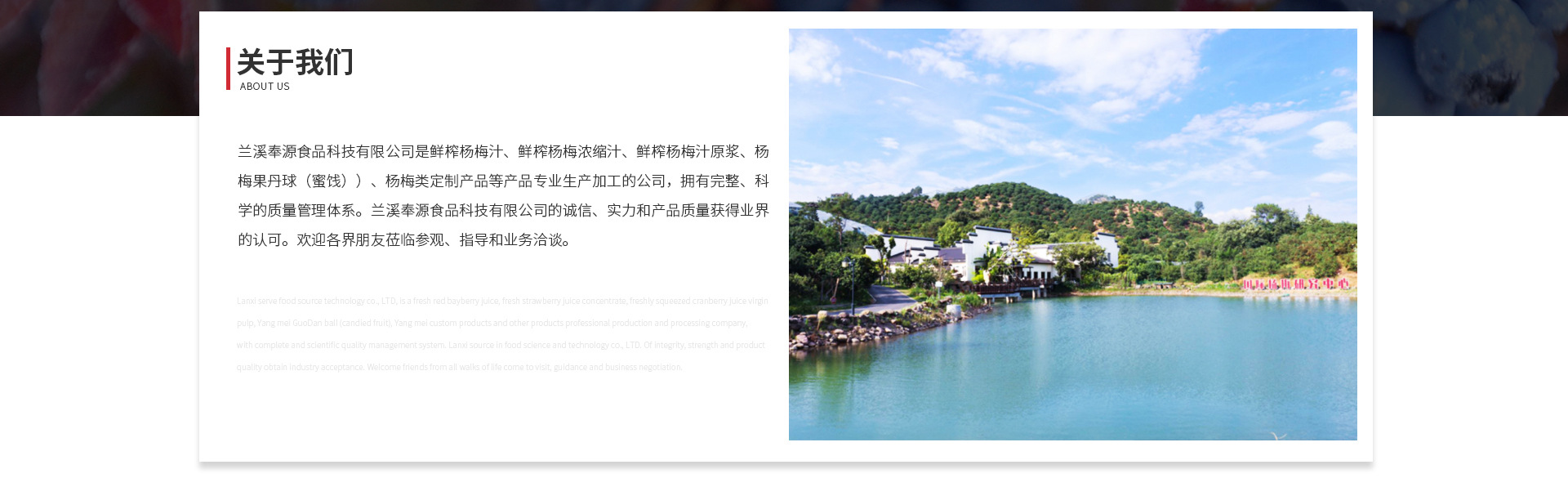 蘭溪奉源食品科技有限公司是一家集楊梅種植管理、鮮果采摘和楊梅深加工制品研發、生產、銷售為一體的有限責任公司。 公司擁有30多年的楊梅種植技術和2000多畝的楊梅種植基地;專業種植技術人員30多人;楊梅種植過程當中全程不使用農藥、化肥。是國家地理標志農產品、國家綠色食品。 深加工體系于2019年01月份創立,擁有目前國內最新進的低溫鮮榨技術,與國際楊梅研究中心、浙江省農科院等頂級科研單位戰略合作,由其提供產品研發及技術支持。目前所生產的冰鮮楊梅汁及濃漿產品已獲得國家綠色食品認證。雖然生加工企業成立時間很短,但在業界異軍突起,勢頭強勁;已引起了業內廣泛的關注和強烈的反響。