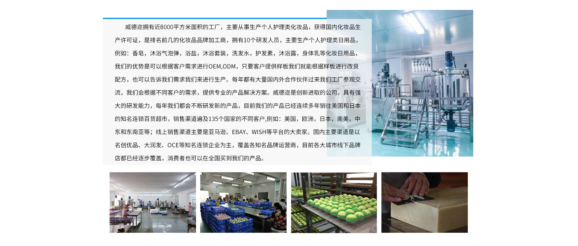 廣州市威德邇科技有限公司成立于2004年,是一家集設計、研發、生產、加工為一體的多元化、專業化和技術化的個人護理品牌公司。公司名字:威德邇,取自世界上第四大的海洋---威德爾海,這是從未被人類征服和探索的大海!公司取這個名字寓意為:威名遠揚,希望有一天我們可以成為行業的引領者和行業規則的制定者!德行天下,像大海一樣以包容的心態去接納所有的人才!聞名遐邇,希望有一天,威德邇的品牌和產品可以拓展到全世界。 我們公司的愿景是:創造美好生活!我們公司的文化:因為信任,所以簡單!客戶第一!團隊合作!簡單純粹!我們能夠為合作伙伴提供美容美發個人護理產品研發,設計,生產等一系列的服務。我們團隊管理層有來自世界500強上市公司品牌運營總監,曾經培養了數家不同行業的出口龍頭企業,對團隊管理,公司文化品牌營銷和企業發展有自己獨特的見解!有自上市公司的技術總監和研發工程師,能夠根據客戶需求研發出適合市場的產品,
