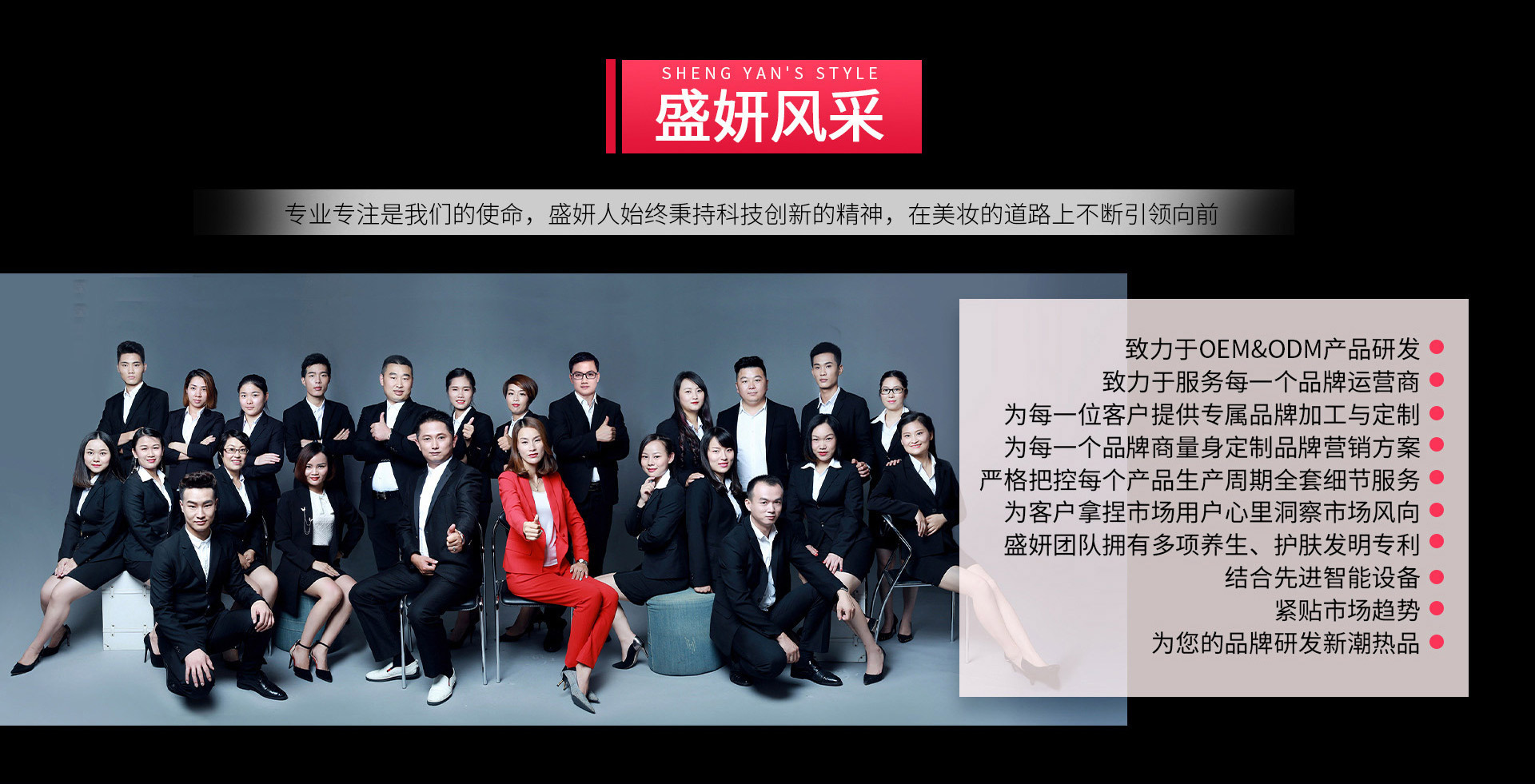 廣州盛妍精細化工有限公司,主要業務為院線面部護膚產品,養生產品、研發生產、OEM/ODM為主。擁有專業團隊200人,與國內外20余家知名科研機構開展聯合實驗室,全自動面膜灌裝機3臺,日產10萬片,全自動安瓶灌裝機日產15萬支,全自動軟管灌裝機日產7萬支,全自動水乳霜灌裝線,日產15萬支。 年產值30000萬,強大的研發、市場服務團隊和現金流決定了企業的實力及服務能力。公司立志為渠道商及消費者提供一流的產品和服務,成為中國美業市場份額與品牌業績同步增長的行業領跑者!