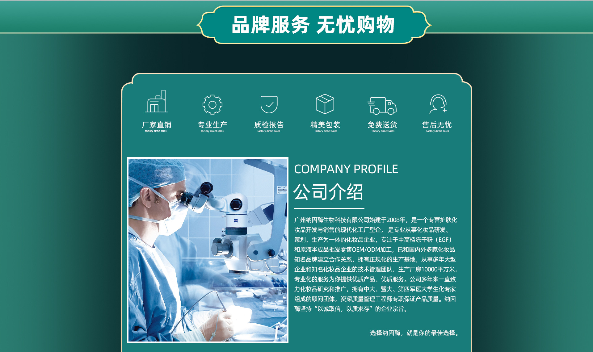 廣州納因酶生物科技有限公司始建于2008年,是一個專營護膚化妝品開發(fā)與銷售的現(xiàn)代化工廠型企, 是專業(yè)從事化妝品研發(fā)、策劃、生產(chǎn)為一體的化妝品企業(yè),專注于中高檔凍干粉(EGF)和原液半成品批發(fā)零售OEM/ODM加工,已和國內(nèi)外多家化妝品知名品牌建立合作關(guān)系,擁有正規(guī)化的生產(chǎn)基地,從事多年大型企業(yè)和知名化妝品企業(yè)的技術(shù)管理團隊,生產(chǎn)廠房10000平方米,專業(yè)化的服務(wù)為你提供優(yōu)質(zhì)產(chǎn)品、優(yōu)質(zhì)服務(wù)。公司多年來一直致力化妝品研究和推廣,擁有中大、暨大、第四軍醫(yī)大學(xué)生化專家組成的顧問團體,資深質(zhì)量管理工程師專職保證產(chǎn)品質(zhì)量。 納因酶堅持“以誠取信,以質(zhì)求存”的企業(yè)宗旨。 本公司特色產(chǎn)品《凍干粉》《原液》 主要產(chǎn)品為洗面奶類、面膜類、眼膜類、護膚膏霜類、護膚乳液類、各系列套裝……OEM等 選擇納因酶,就是你的最佳選擇。
