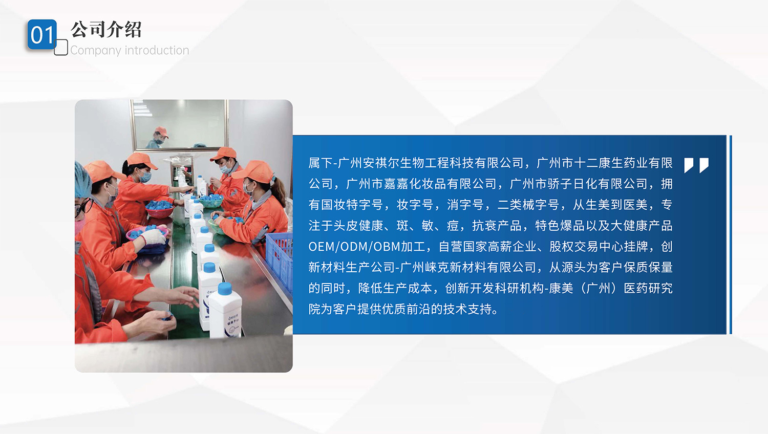 屬下-廣州安祺爾生物工程科技有限公司,廣州市十二康生藥業(yè)有限公司,廣州市嘉嘉化妝品有限公司,廣州市驕子日化有限公司,擁有國(guó)妝特字號(hào),妝字號(hào),消字號(hào),二類械字號(hào),從生美到醫(yī)美,專注于頭皮健康、斑、敏、痘,抗衰產(chǎn)品,特色爆品以及大健康產(chǎn)品OEM/ODM/OBM加工,自營(yíng)國(guó)家高薪企業(yè)、股權(quán)交易中心掛牌,創(chuàng)新材料生產(chǎn)公司-廣州崍克新材料有限公司,從源頭為客戶保質(zhì)保量的同時(shí),降低生產(chǎn)成本,創(chuàng)新開(kāi)發(fā)科研機(jī)構(gòu)-康美(廣州)醫(yī)藥研究院為客戶提供優(yōu)質(zhì)前沿的技術(shù)支持。
