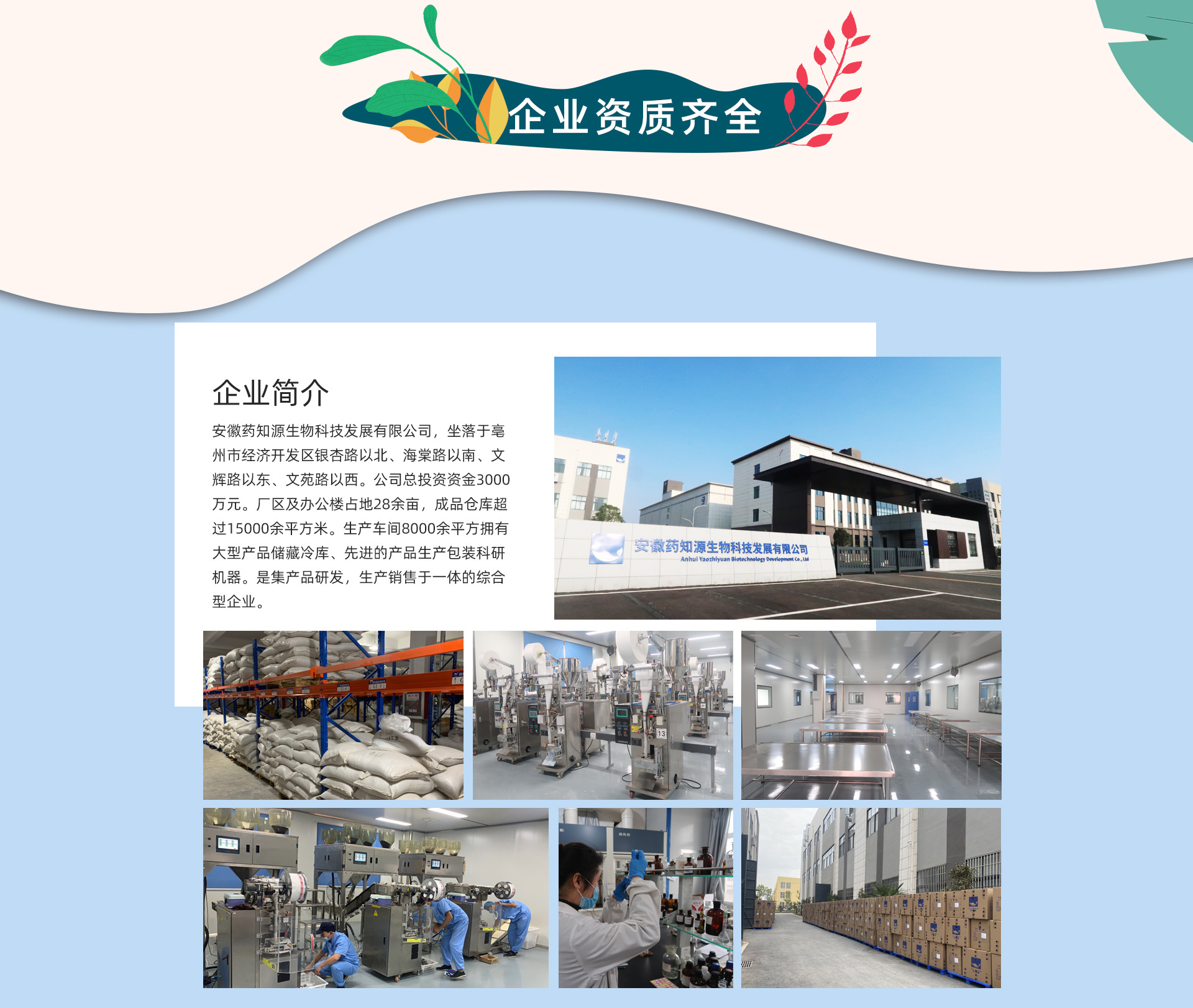 公司從事專業(yè)從事花草茶成品批發(fā)、花果茶成品批發(fā),固體飲料,方便食品,代用茶,調(diào)味茶OEM代加工。在亳州市交易中心擁有多家實(shí)體店門,經(jīng)營(yíng)上百種花茶品種。現(xiàn)已具備四條食品生產(chǎn)線及一條消字號(hào)用品生產(chǎn)線。藥知源花茶及其絕對(duì)的價(jià)格優(yōu)勢(shì)與多家花茶公司、淘寶店主、商場(chǎng)、超市、大藥房及自主創(chuàng)業(yè)者建立了良好的合作關(guān)系。