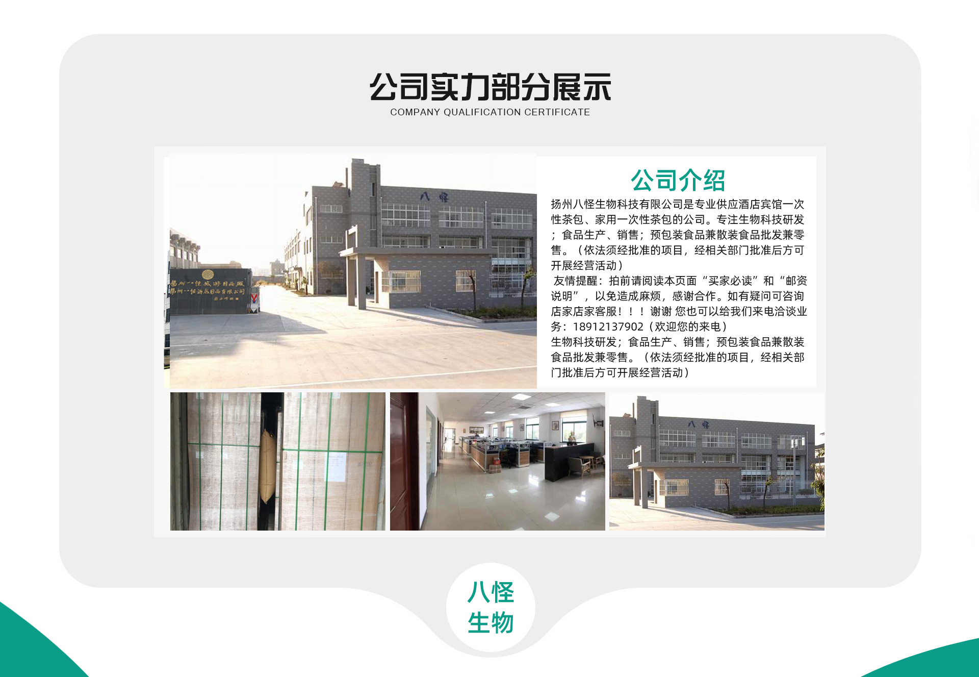 揚州八怪生物科技有限公司是專業供應星級酒店賓館一次性茶包、家用一次性茶包的公司。專注生物科技研發;食品生產、銷售;預包裝食品兼散裝食品批發兼零售。(依法須經批準的項目,經相關部門批準后方可開展經營活動)