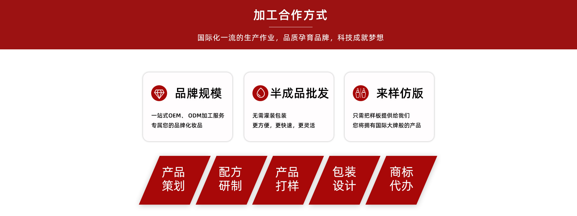 全球進入服務型經濟時代,尤其是個性化定制型服務模式成為市場潮流--服務,已演變成為企業滿足消費者過程中最具核心的競爭力。 “自主、靈活、收益、價值”的完美組合使OEM服務倍受青睞,OEM解決方案將成為您公司的明智選擇。 由您做主,根據您的愿望,不需龐大投資,節省各個環節的咨詢顧問,未來團隊可為您生產出符合歐美標準的護膚品; 優良的品質、實惠的價格、快速的反應、直接的溝通將盡顯未來服務的省心和專業。 豐富的市場經驗和優秀的合作伙伴貫穿于我們服務的每一步,未來將成為您打造未來著名品牌的重要成部分。