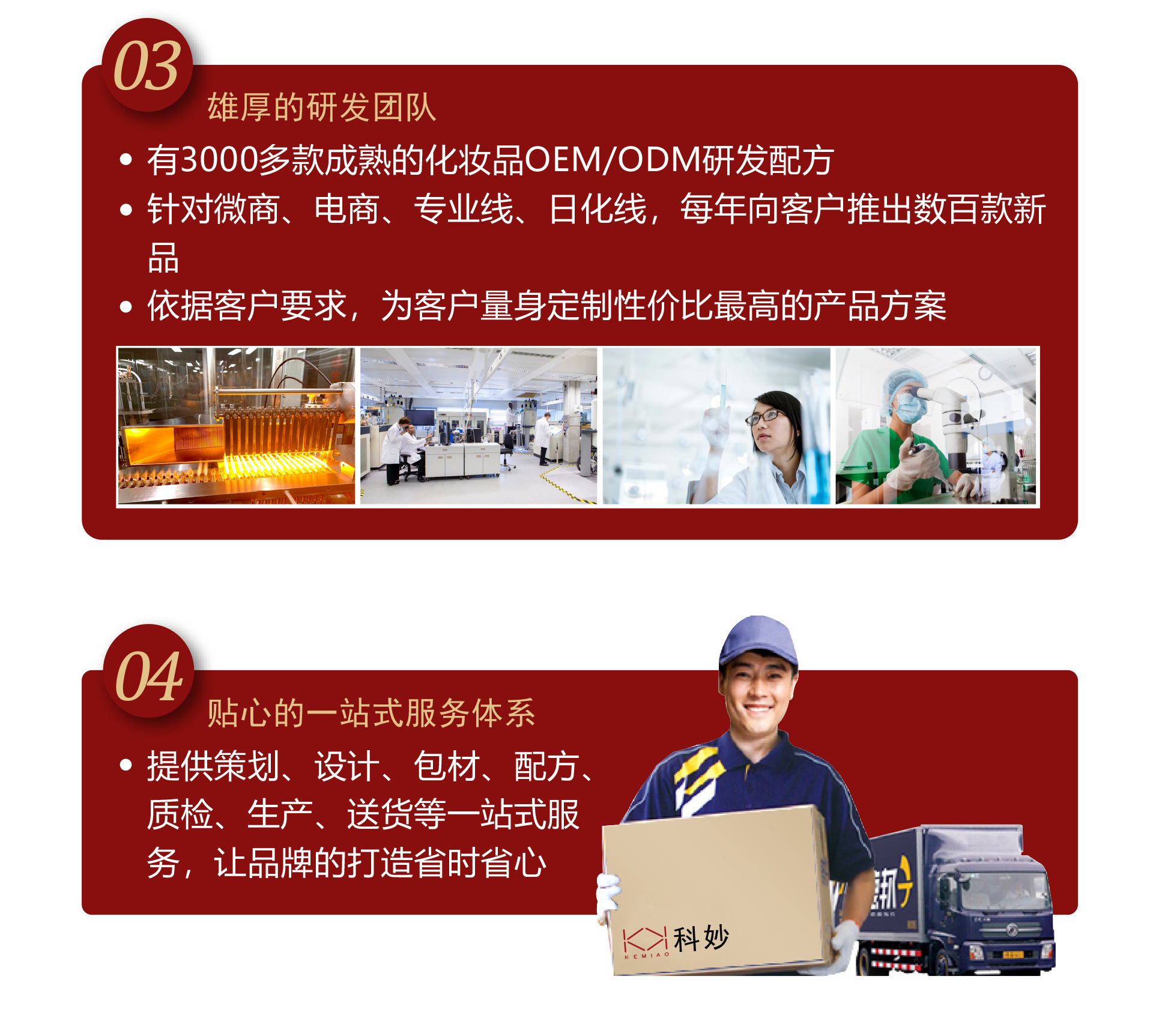 廣州科妙生物科技有限公司 (簡稱科妙生物) 是一家專業化妝品OEM/ODM 生產基地,座落在美麗的流溪河旁,依山畔水,環境優美。28 分鐘就可快速到達 廣州白云國際機場,交通便利。 本公司產品具有前瞻性、合理性、植物性、相溶性、專業性、穩定性、安全 性、特效性。明星產品突出,致力于全方位服務電商、微商、線下品牌,美容專業 線等客戶群體。 科妙生物擁有實際使用面積 48183多平方米的現代化工業廠房,自動化流水 生產線 16 條,保障了每天不低于 30萬支合格產品的產量!工廠嚴格按照十萬級 GMPC 生產標準建設, 并通過 ISO國際體系認證、 標準進行設計建造 7S 管理原則、 高標準的生化研究室和檢驗室,綠色環保 600Kwp 光伏項目的使用,確保技術優勢 所需硬件要求,領先同行業競爭對手。本公司的原料采購遍及世界各大主流產區,