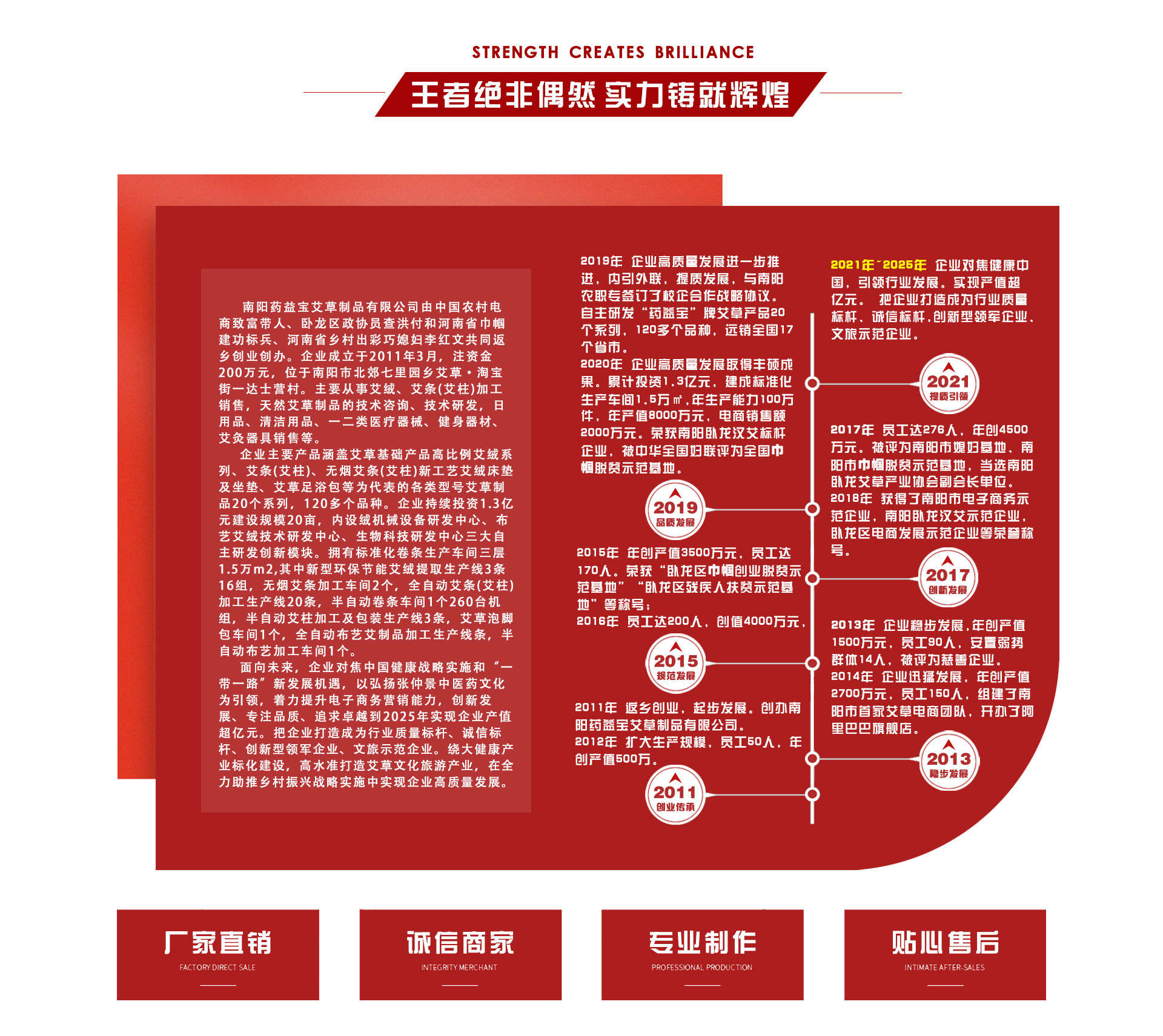 南陽藥益寶艾草制品有限公司成立于2011年初,由臥龍區政協委員、臥龍區科技拔尖人才、返鄉創業精英查洪付帶領團隊注資200萬元創建。坐落在南陽市特色小鎮達士營村艾草·淘寶街,占地20畝。持續投資1.3億元,建有艾絨機械設備研發中心、布藝艾絨技術研發中心、生物科技研發中心,擁有標準化卷條生產車間三層1.5萬㎡,其中艾絨自動提取生產線3條16組,全自動卷條生產線8條,半自動卷條車間1個卷條機器150臺套,無煙艾條加工車間2個,艾草泡腳包車間1個,全自動布藝艾制品車間1個,艾柱切割生產線3條、包裝生產線2條。現已發展成為河南省首家集艾制品生產研制、艾絨機械設備制造、布藝艾絨產品開發、艾草超臨界精油萃取分裝、高端艾草洗化產品研發、艾灸體驗等為一體的全產業鏈特色民營實體企業。常年倉儲三年陳艾2萬噸,年生產各類艾制品12萬箱,年加工原材料6000余噸,2019年實現產值8000余萬元。