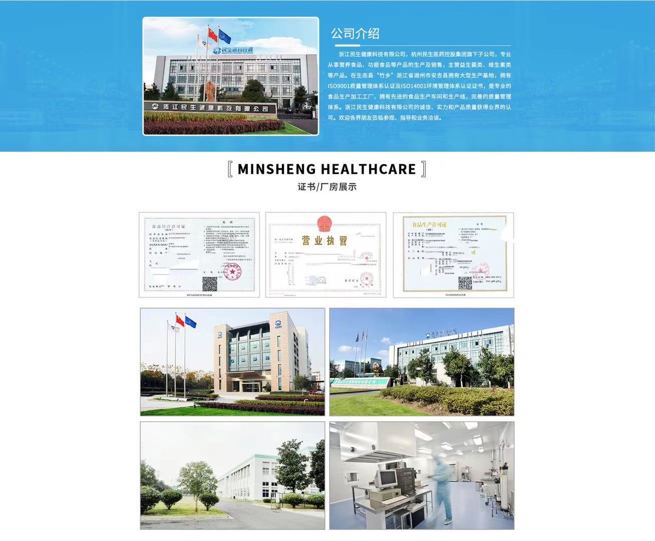 浙江民生健康科技有限公司專業從事保健食品、營養食品、功能食品等健康產品的生產及銷售,主營益生菌類、維生素類、保健食品等健康產品,在國家級生態縣“竹鄉”浙江省湖州市安吉縣擁有大型生產基地,是專業的保健食品生產加工工廠,擁有先進的保健食品生產車間和生產線,完善的高標準的質量管理體系,擁有ISO9001質量管理體系認證及ISO14001環境管理體系認證證書,可常年生產顆粒劑、粉劑、片劑、膠囊劑等各類制劑,是您值得信賴的合作伙伴