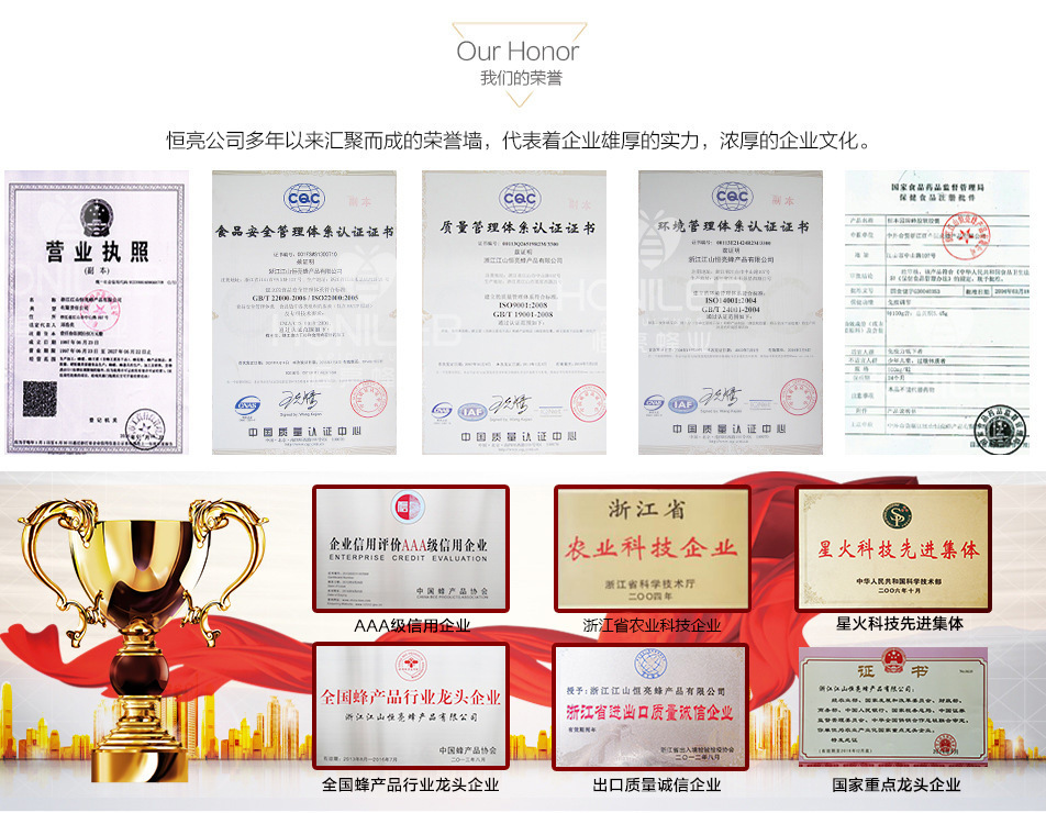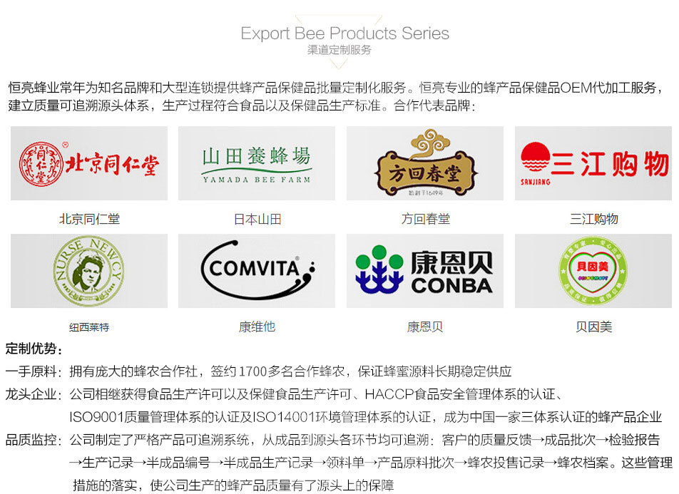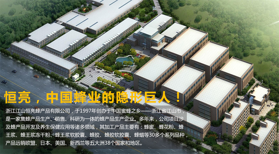 浙江江山恒亮蜂產品股份有限公司位于中國著名的蜜蜂之鄉--浙江省江山市。公司創辦于1997年,是一家集蜂產品生產、銷售、科研為一體的蜂產品專營公司。主要產品有蜂王漿、蜂王漿凍干粉、蜂膠、蜂花粉、蜂蜜、蜂蠟、蜂蜜飲料、蜂膠軟膠囊、蜂王漿軟膠囊等30多個系列品種,產品銷往歐盟、日本、美國、新西蘭等38個國家和地區。自2007年起至今已連續15年蜂王漿出口排名第一,是中國國家級重點農業龍頭企業。 公司在2002年開始按照歐盟2092/91有機農業生產條例的標準建立養蜂生產基地,并建立了產品質量源頭可追溯體系,使公司生產的每批產品都可追溯到具體的蜂場編號、產地、花源及用藥等信息,從源頭上控制了蜂產品的原料質量。公司目前建有700多個養蜂場,蜂群數達9.5萬多群,并在2002年度率先通過了歐盟ECOCERT有機蜂王漿認證,成為國際上首家生產有機蜂王漿的企業。
