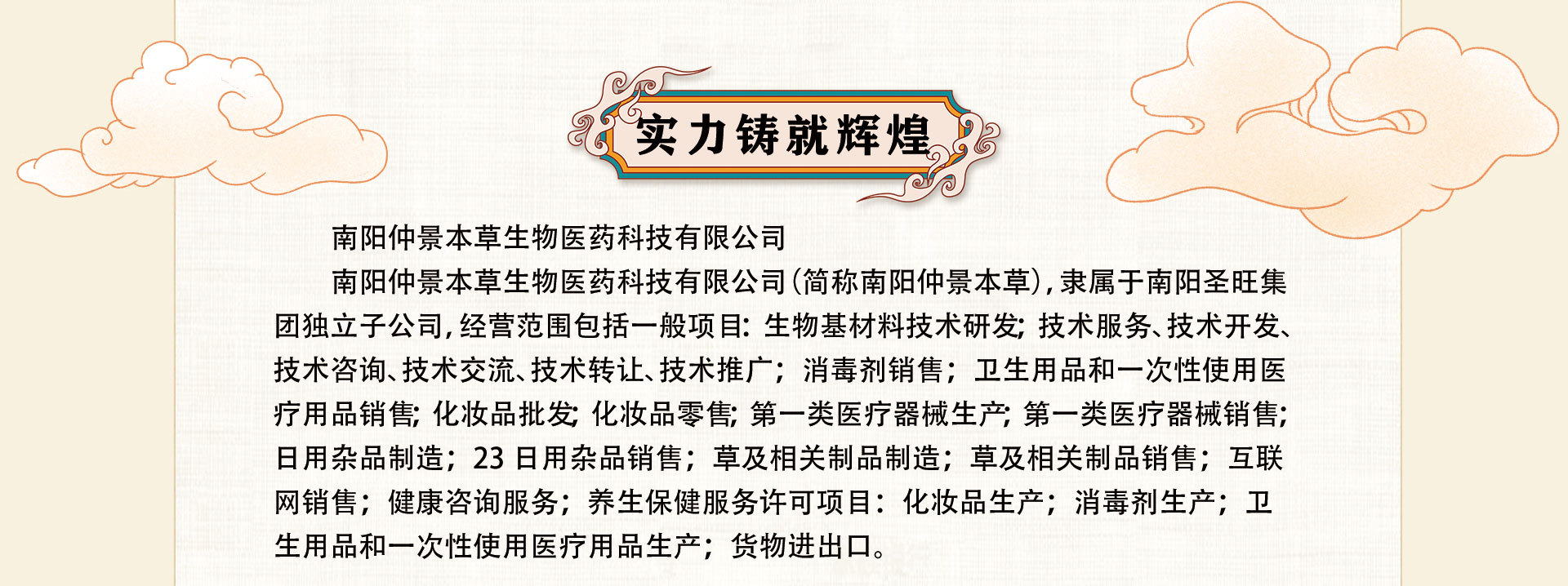 南陽仲景本草生物醫藥科技有限公司是國內首創“中醫古法熬制與現代生產工藝相結合”,是中醫外治療法應用的領先企業,企業注冊資金1080萬,隸屬于百年圣旺集團。地處醫圣張仲景故里,天然中草藥資源豐富,地道中藥達上千種。南陽仲景本草以仲景文化為核心,以弘揚仲景本草,傳承中醫外治為理念,為讓更多的人遠離疼痛,脫離亞健康搭建平臺,提供優質服務及絕佳珍品。公司創建以來致力于產品結構的優化,品牌包裝策劃賦能,運營標準化模式升級調整、客戶服務和渠道的全面管理。現擁有南陽仲景本草中醫外治研究院及產銷一體化供應鏈的巨大優勢,并不斷的對產品及供銷模式進行研發、升級、調整。通過完善的體系,南陽仲景本草竭力為聯合創始人和共享合伙人,提供高附加值的產品和完善的售后服務,助力大家擁有更多的市場份額,創造更多的價值和財富。