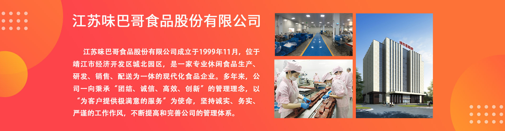 江蘇味巴哥食品股份有限公司,始創(chuàng)于2004年,是一家專業(yè)從事食品科研、生產(chǎn)、銷售于一體的股份制私營(yíng)企業(yè),坐落于魚米之鄉(xiāng)江蘇靖江。公司擁有“味巴哥”“谷大叔”兩大品牌,致力于打造“綠色、健康、美味”的休閑食品。