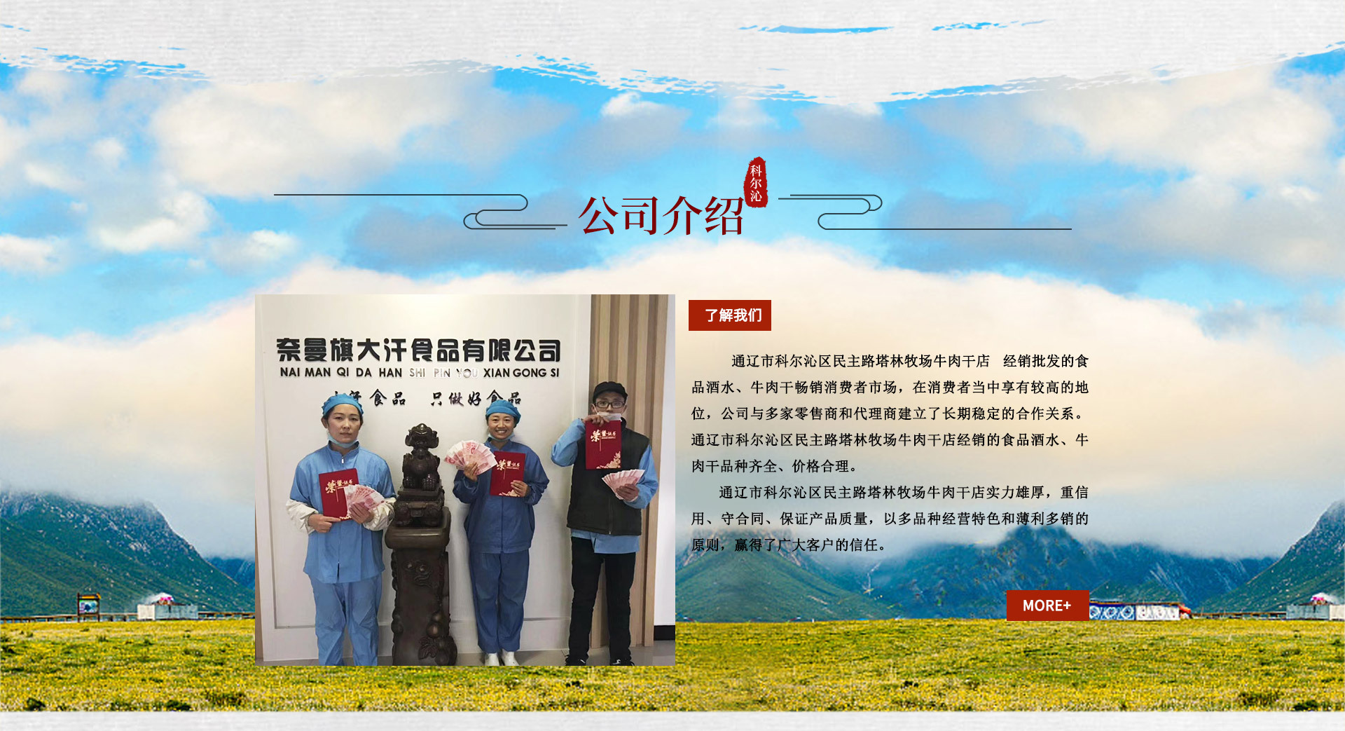 內蒙古通遼市奈曼旗大汗食品有限責任公司成立于2006年,注冊資金50萬,占地面積12000平方米,公司下設采購部,生產部.質檢部.市場營銷部等部門,員工近200人。集現代食品生產加工、產品研發、營銷服務于一體,公司以生產特色風干牛肉干為主要生產項目。我公司將永遠奉行“質量第一、信譽第一、服務至上”的原則,不斷完善和發展,滿足消費者的需求。