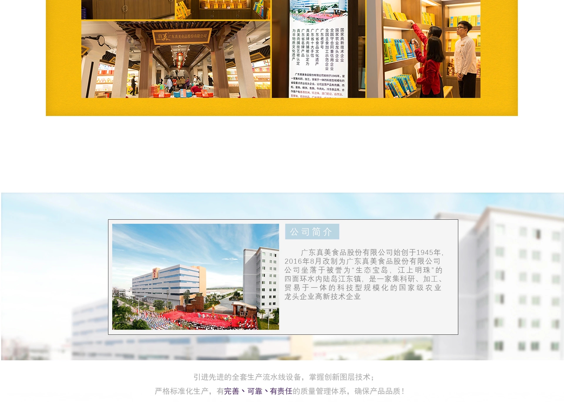 廣東真美食品股份有限公司是肉脯、肉松、肉干、糕點餅食、冷凍食品等產品專業生產加工的公司,公司擁有國際領先水準的開發、檢驗及生產儀器設備,采用國際上先進的質量檢測手段及質量保證體系,建立完善的質量保證體系,確保所有產品品質安全符合國際標準和要求。先后通過ISO9001、ISO14001、OHSAS18001、ISO22000 及HACCP 國際管理體系認證、QS 認證及出口食品生產企業衛生注冊證書等。目前公司擁有核心技術授權發明專利21項,先后主導及參與《肉脯》、《肉干》、《肉松》、《肉制品分類》、《糖果分類》、《真空軟包裝鹵肉制品》等二十多項國家及行業標準的制訂工作。廣東真美食品股份有限公司的誠信、實力和產品質量獲得業界的認可。歡迎各界朋友蒞臨參觀、指導和業務洽談。
