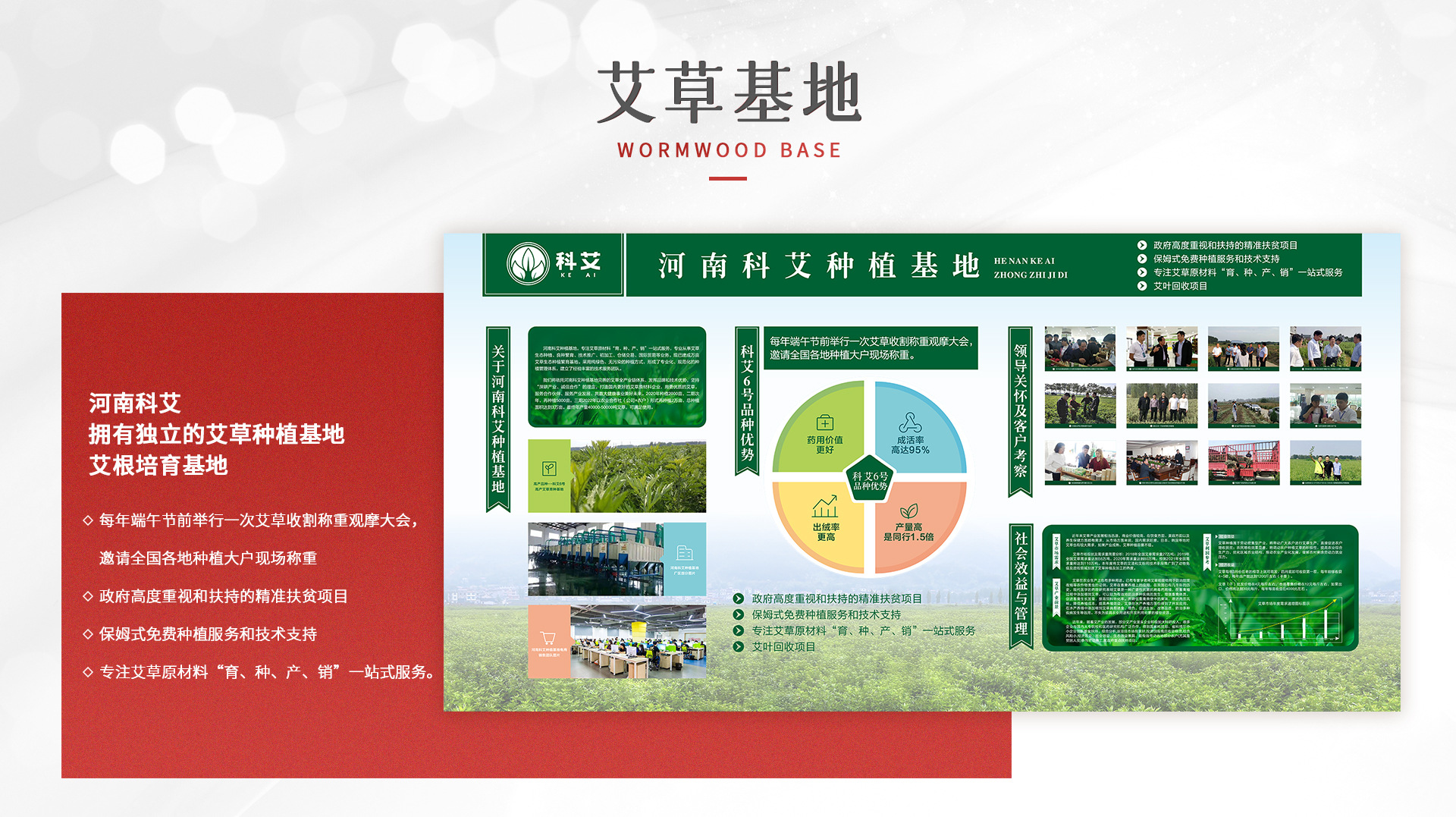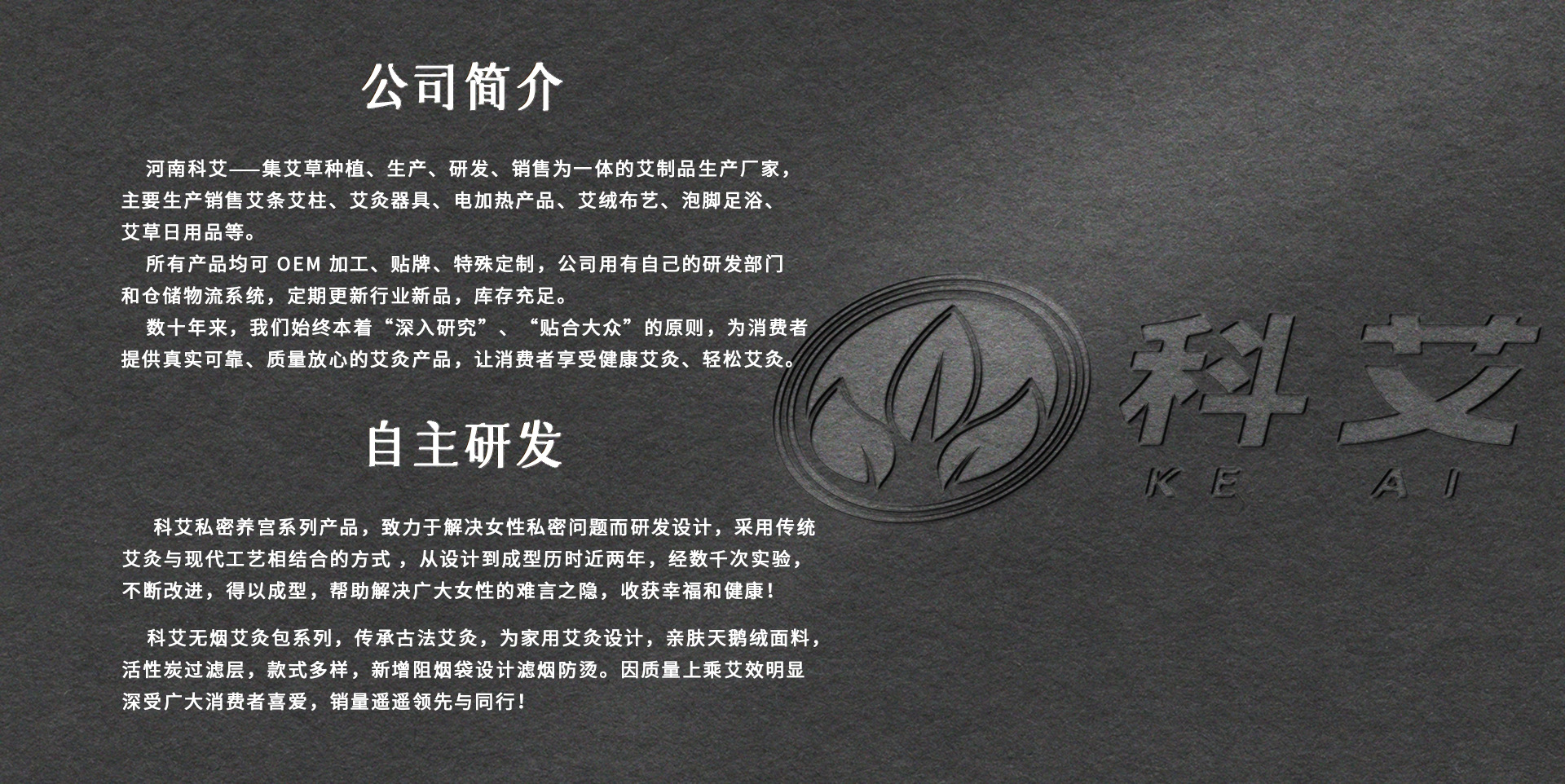 河南科艾健康管理有限公司立足于中國最大的艾制品源頭產地--南陽,在省會鄭州設有運營中心,主要生產艾條艾柱、艾灸器具、電加熱產品、各種貼類、足浴日用等各種艾制品,擁有二十余臺大型專利提絨機組,可24小時不間斷供應艾絨。主廠區廠房面積超過三萬余平米,年艾草存儲量達三萬噸,艾制品生產車間擁有熟練工人400名,配備半自動卷條機120臺,全自動卷條機17臺,全自動切條機8臺,全自動塑封機5臺以及艾餅壓制機等各類先進設備近400臺,可日產艾柱五萬盒,艾條八萬盒,艾餅十萬片,艾灸貼類五十萬貼,電加熱產品五萬套,艾灸器具五萬套。布藝車間擁有全自動縫紉機120臺,大型布藝下料機2臺,日產艾灸布套上萬套,支持各類艾絨家紡產品的個性化定制。 公司擁有專業設計師10余人,平均3年以上的產品研發設計經驗,多位資深設計師有北上廣等地的大型公司工作經驗。