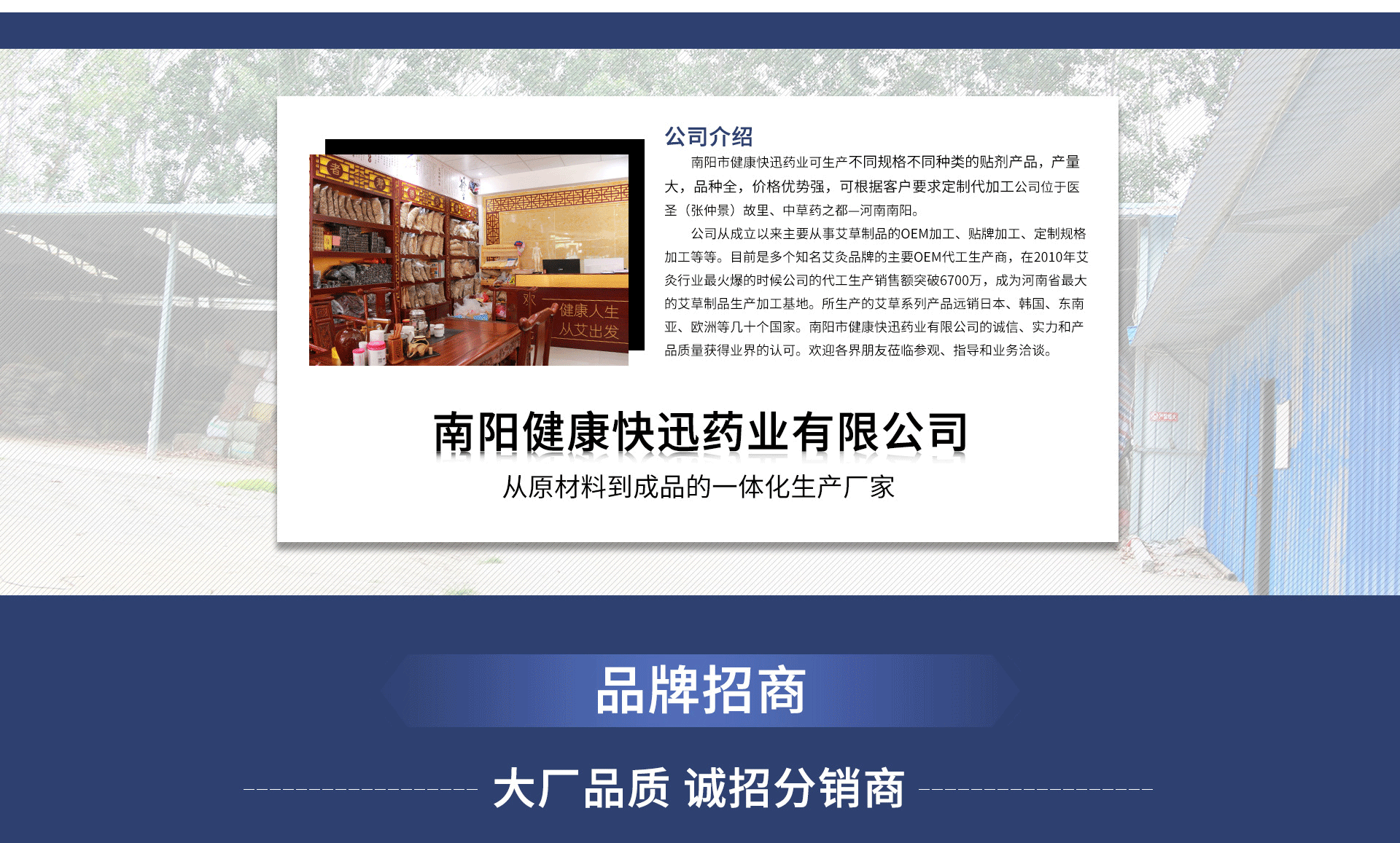 南陽市健康快迅藥業有限公司是外用貼劑產品專業生產加工企業,公司擁有完整、科學的質量管理體系。公司擁有大型反應釜、涂布機、切片機、分切機、灌裝機數十套,日產外用貼膏百萬片,公司現有健字批準文號、第三方檢測報告等滿足各種平臺用戶貼牌代加工需求!南陽市健康快迅藥業有限公司的誠信、實力和產品質量獲得業界的認可。歡迎各界朋友蒞臨參觀、指導和業務洽談。