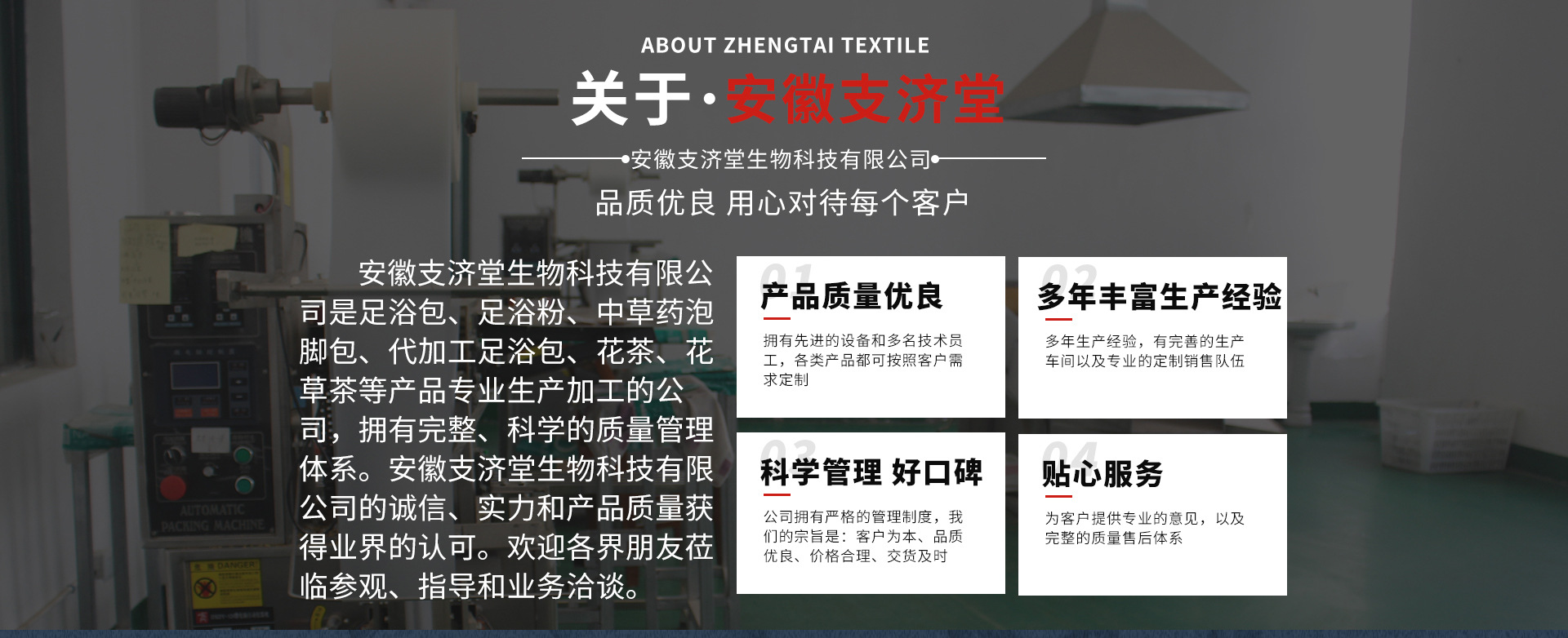 安徽支濟堂生物科技有限公司是足浴包、足浴粉、中草藥泡腳包、代加工足浴包、花茶、花草茶等產品專業生產加工的公司,擁有完整、科學的質量管理體系。安徽支濟堂生物科技有限公司的誠信、實力和產品質量獲得業界的認可。歡迎各界朋友蒞臨參觀、指導和業務洽談。