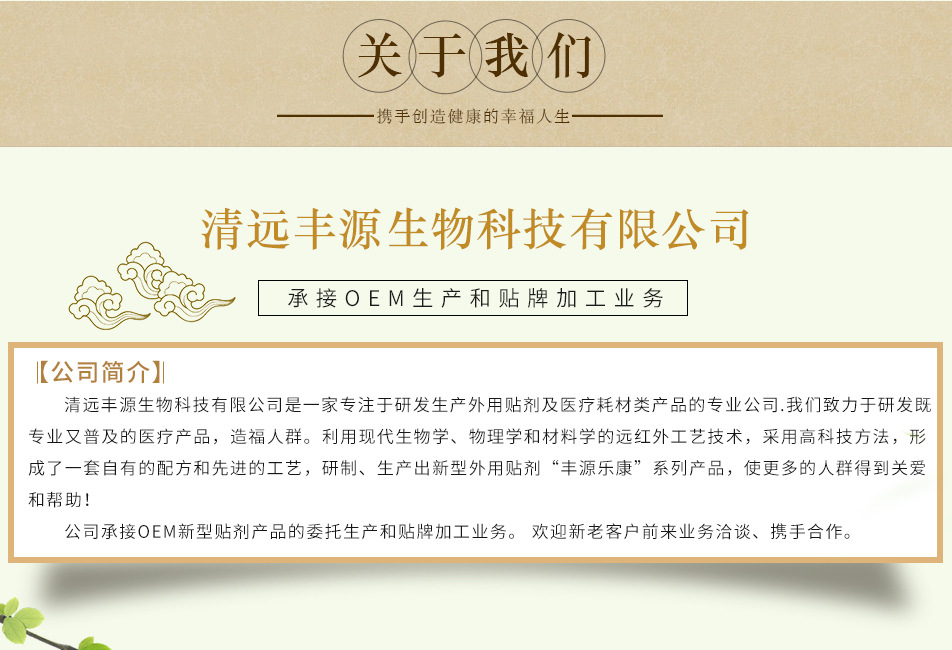 清遠豐源生物科技有限公司成立于2012年3月,公司位于廣東省清遠市國家示范高新技術開發區,注冊資金一百萬元。主營國家一類醫療器械,生物科技領域內的技術研發、各類商品及技術的進出口等三十多項產品。 清遠豐源生物科技有限公司是一家專注于研發生產外用貼劑及醫療耗材類產品的專業公司.我們致力于研發既專業又普及的醫療產品,造福人群。利用現代生物學、物理學和材料學的遠紅外工藝技術,采用高科技方法,形成了一套先進的工藝,研制、生產出新型外用貼劑“豐源樂康”系列產品(生產銷售貼牌退熱貼、醫用冷敷貼、液體傷口敷料、透氣膠貼、醫用冷敷眼罩(眼舒貼)、冷敷凝膠、超聲耦合劑等加工三九貼三伏貼、大肚貼、塑身貼、暖宮貼、足貼、OEM貼牌加工),使更多的患者得到關愛和幫助! 公司承接OEM新型貼劑產品的委托生產和貼牌加工業務。
