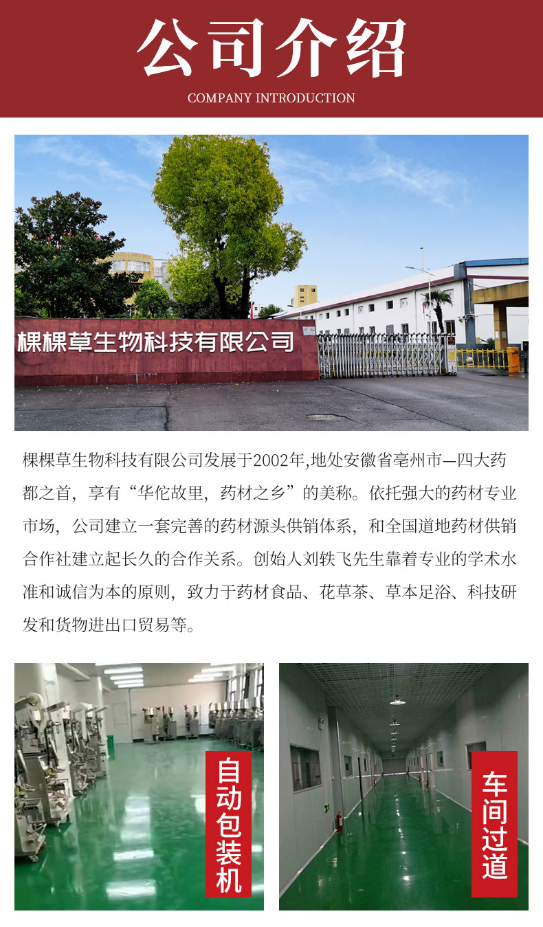 亳州棵棵草生物科技有限公司是中藥材、泡澡包、足浴包、花草茶、藥食同源等產品專業生產加工的公司,擁有完整、科學的質量管理體系。亳州棵棵草生物科技有限公司的誠信、實力和產品質量獲得業界的認可。歡迎各界朋友蒞臨參觀、指導和業務洽談。