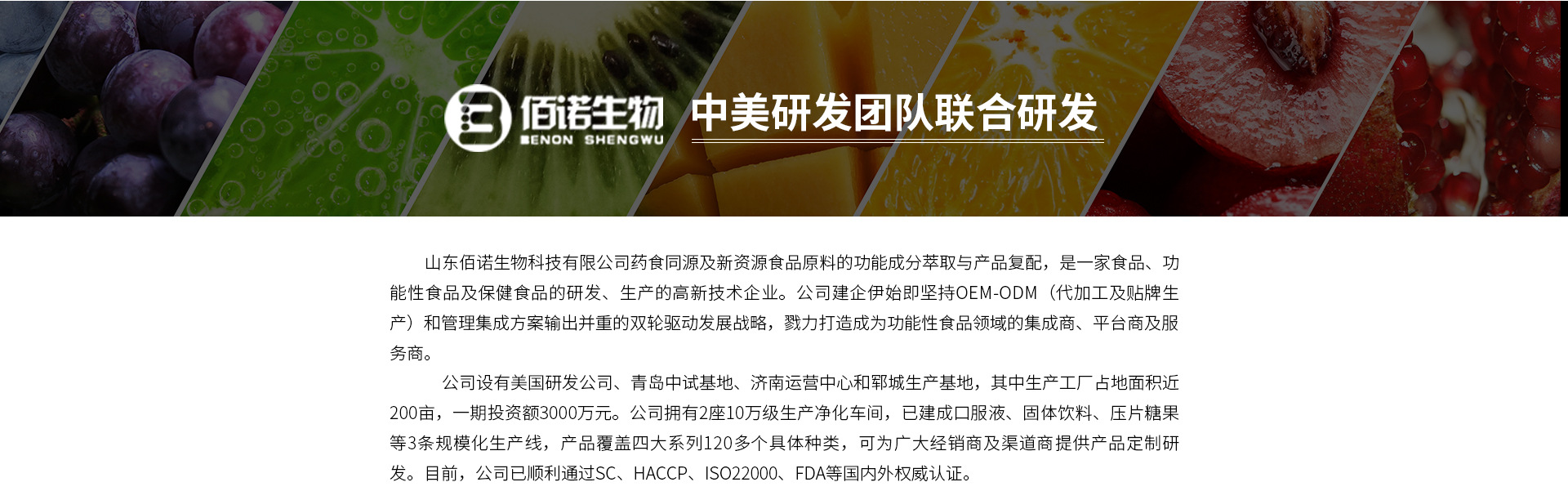 山東佰諾生物科技有限公司是一家集健康食品、功能性食品及保健食品研發、生產、品牌設計及健康管理集成為一體的生物科技公司。公司以“佰煉品質、諾臻健康”為企業精神,一貫遵循“專而精、特而優”的集約化發展路徑,建企伊始即堅持OEM-ODM(代加工及貼牌生產)和健康管理集成方案輸出并重的雙輪驅動發展戰略,戮力打造成為綠色功能性食品領域的健康管理集成商、平臺商及服務商。 公司設有美國研發公司、青島中試基地、濟南運營中心和鄆城生產基地,其中,生產工廠占地面積近200畝。公司擁有2座10萬級標準的生產凈化車間,已全面建成液體飲料、固體飲料、壓片糖果等3條專業化及規模化生產線,產品覆蓋四大系列120多個具體品種,可為廣大健康產品經銷商及渠道商提供集產品定制化研發、生產及品牌設計為一體的健康管理綜合解決方案。目前,公司已順利通過SC、HACCP、ISO22000、FDA備案、出口食品生產企業備案證明等國內外權