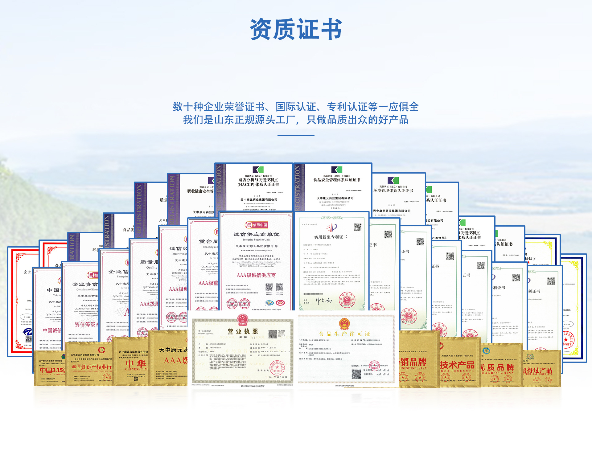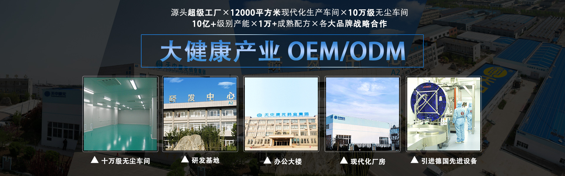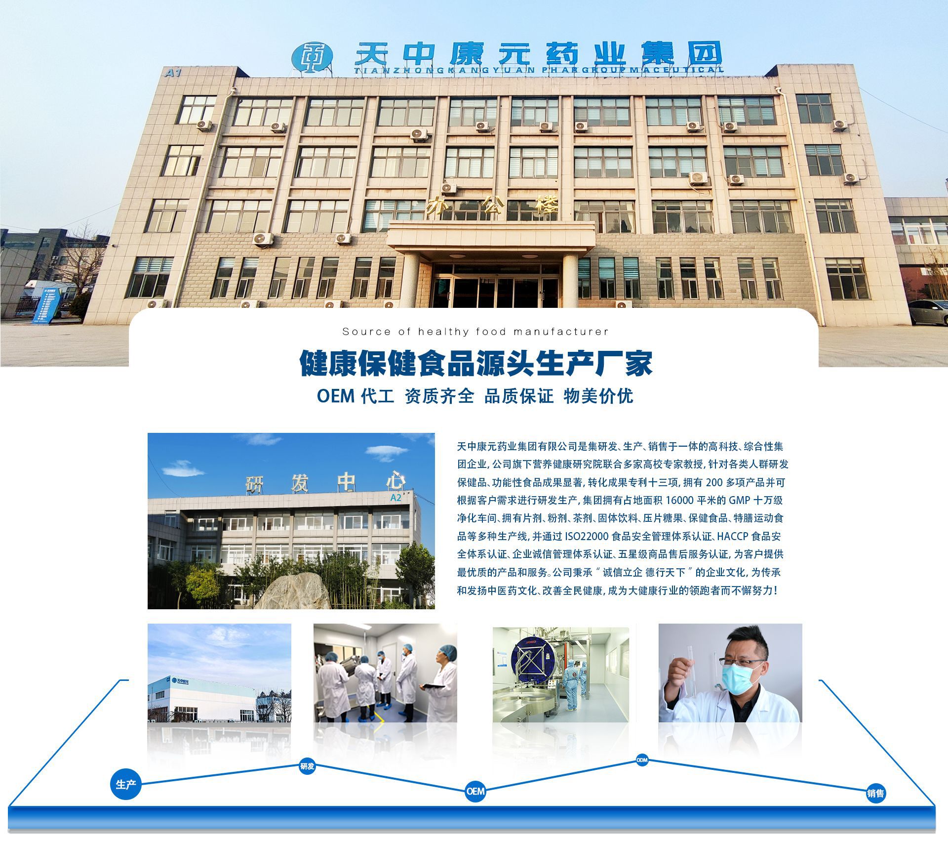 天中康元藥業集團有限公司是集研發、生產、銷售于一體的高科技、綜合性集團企業,公司旗下營養健康研究院聯合多家高校專家教授,針對各類人群研發保健品、功能性食品成果顯著,轉化成果專利十三項,擁有200多項產品并可根據客戶需求進行研發生產,集團擁有占地面積16000平米的GMP十萬級凈化車間、擁有片劑、粉劑、茶劑、固體飲料、壓片糖果、保健食品、特膳運動食品等多種生產線,并通過ISO22000食品安全管理體系認證、HACCP 食品安全體系認證、企業誠信管理體系認證、五星級商品售后服務認證,為客戶提供最優質的產品和服務。公司秉承“誠信立企 德行天下”的企業文化,為傳承和發揚中醫藥文化、改善全民健康,成為大健康行業的領跑者而不懈努力!