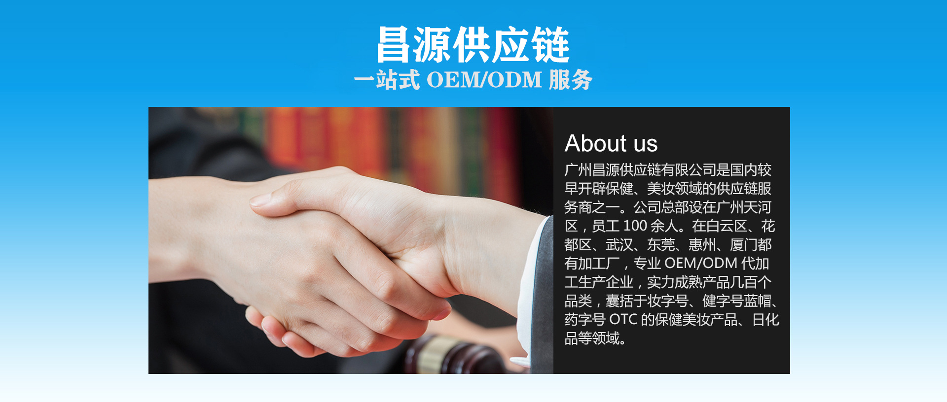 廣州昌源供應鏈有限公司是國內較早開辟保健、美妝領域的供應鏈服務商之一。公司總部設在廣州天河區,員工100余人。在白云區、花都區、武漢、東莞、惠州、廈門都有加工廠,專業OEM/ODM代加工生產企業,實力成熟產品幾百個品類,囊括于妝字號、健字號藍帽、藥字號OTC的保健美妝產品、日化品等領域。