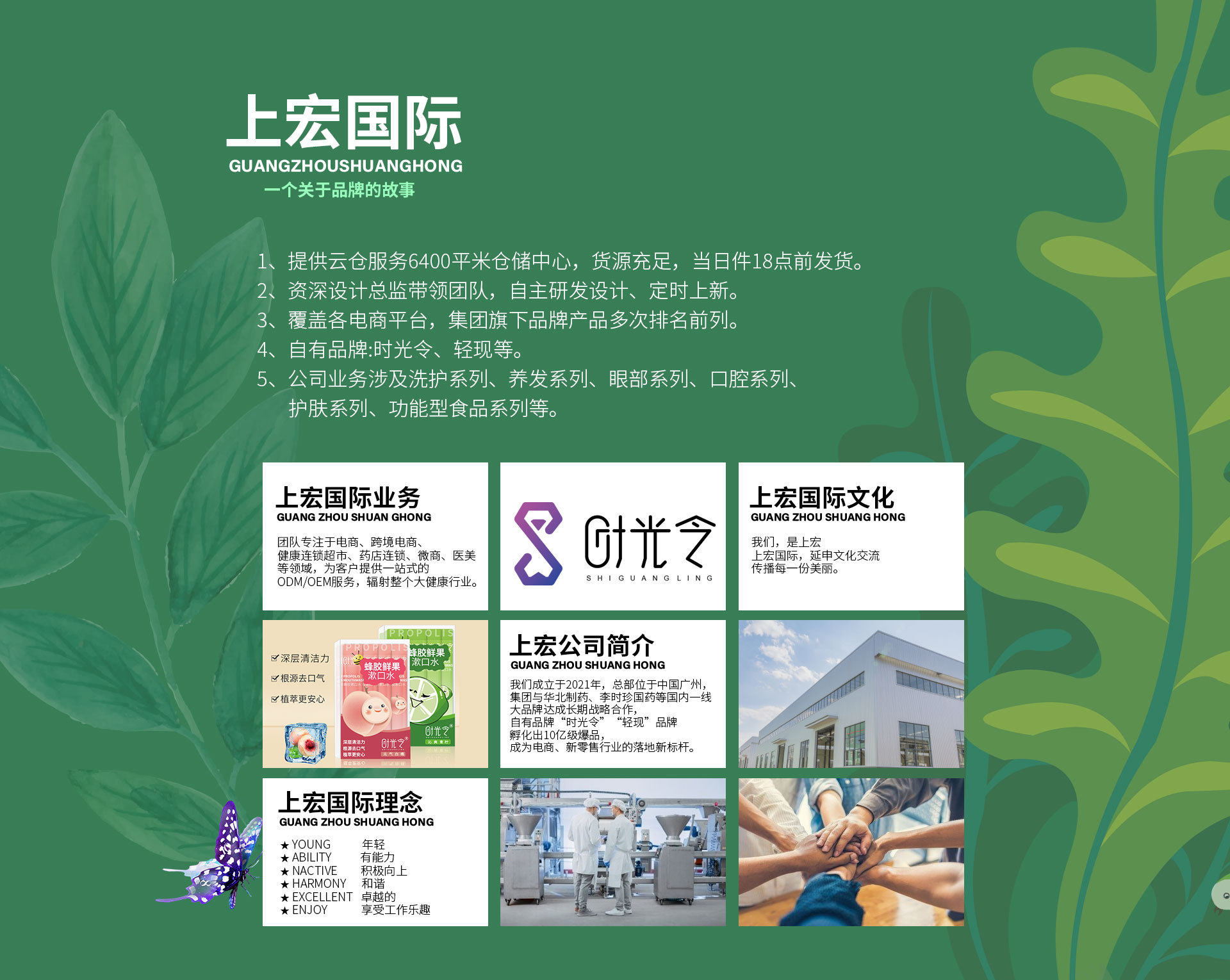 廣州上宏國際供應鏈有限公司成立于2021年,總部位于中國廣州,是一家集加工生產、銷售于一體的集團公司。集團主要負責大健康產業產品的運營和銷售,構建了完整的供應鏈體系,分設20個部門,囊括了產品規劃、包裝設計、采購銷售、品牌策劃、品牌營銷、培訓推廣等功能。團隊專注于電商、跨境電商、健康連鎖超市、藥店連鎖、微商、醫美等領域,為客戶提供一站式的ODM/OEM服務,輻射整個大健康行業。 公司業務涉及洗護系列、養發系列、眼部系列、口腔系列、護膚系列、保健食品系列等,以高附加值產品及品牌為基礎,精準營銷策劃為驅動,顛覆了傳統ODM/OEM代加工模式,為廣大客戶提供優質產品與一站式服務,與合作伙伴互利共贏。 集團與華北制藥、李時珍國藥、中醫藥大學、南京同仁堂等國內一線大品牌達成長期戰略合作,自有品牌“時光令”、“輕現”品牌孵化出10億級爆品,成為電商、新零售行業的落地新標桿。
