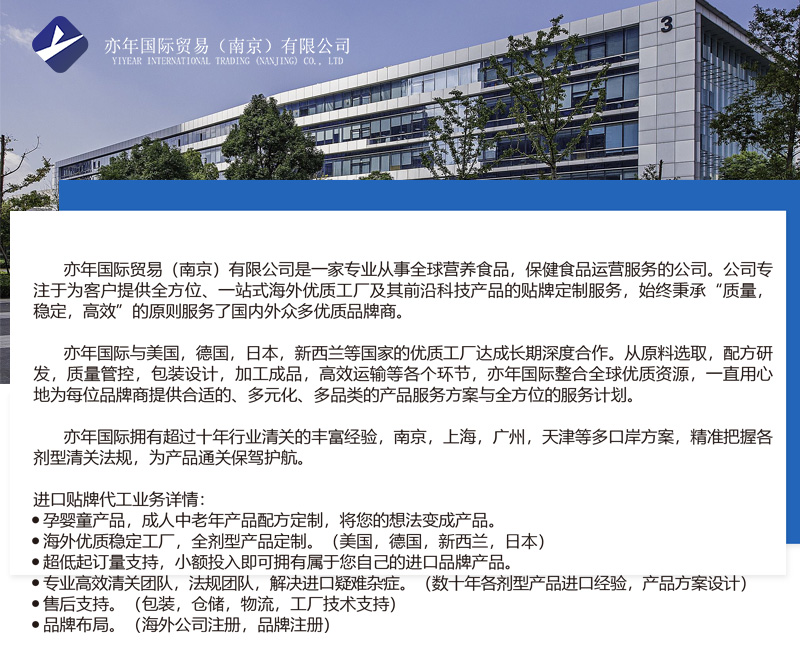 亦年國際貿易(南京)有限公司是一家從事全球營養食品,保健食品運營服務的公司。公司專注于為客戶提供全方位、一站式海外優質工廠及其前沿科技產品的貼牌定制服務,始終秉承“質量,穩定,高效”的原則服務了國內外眾多優質品牌商。