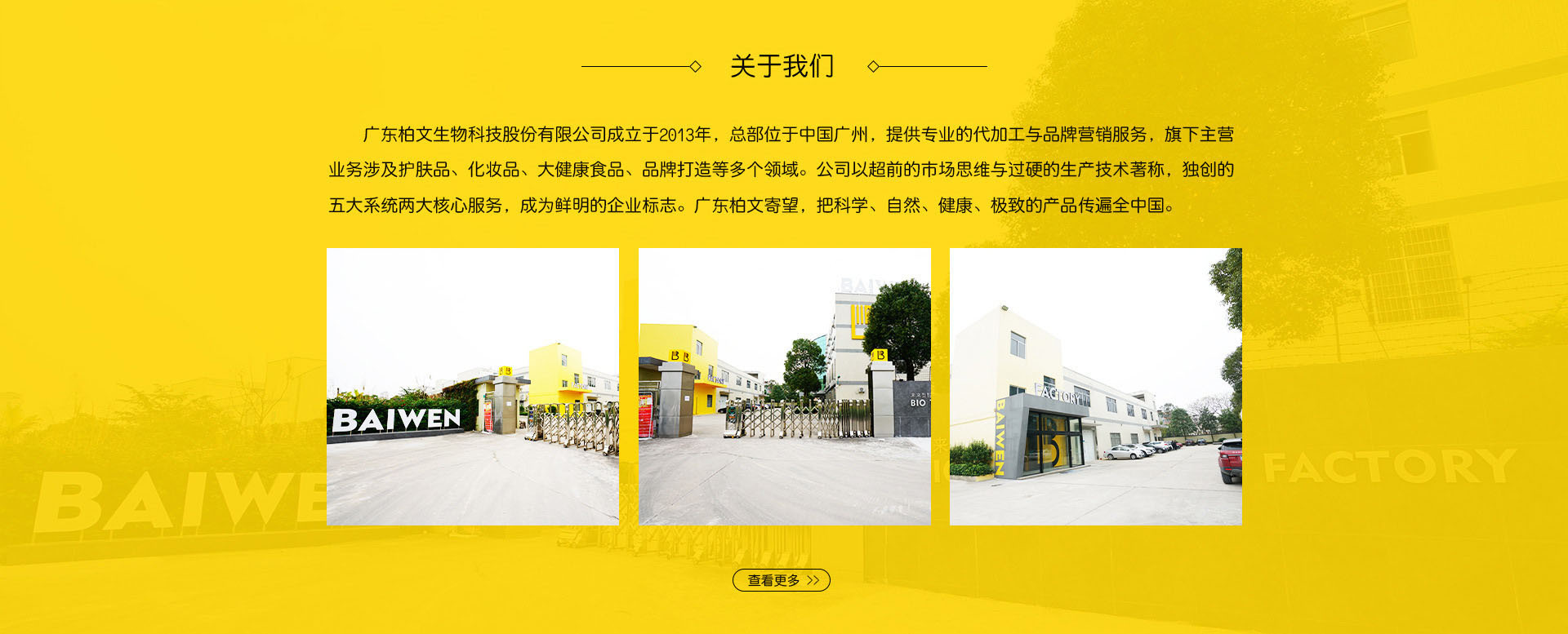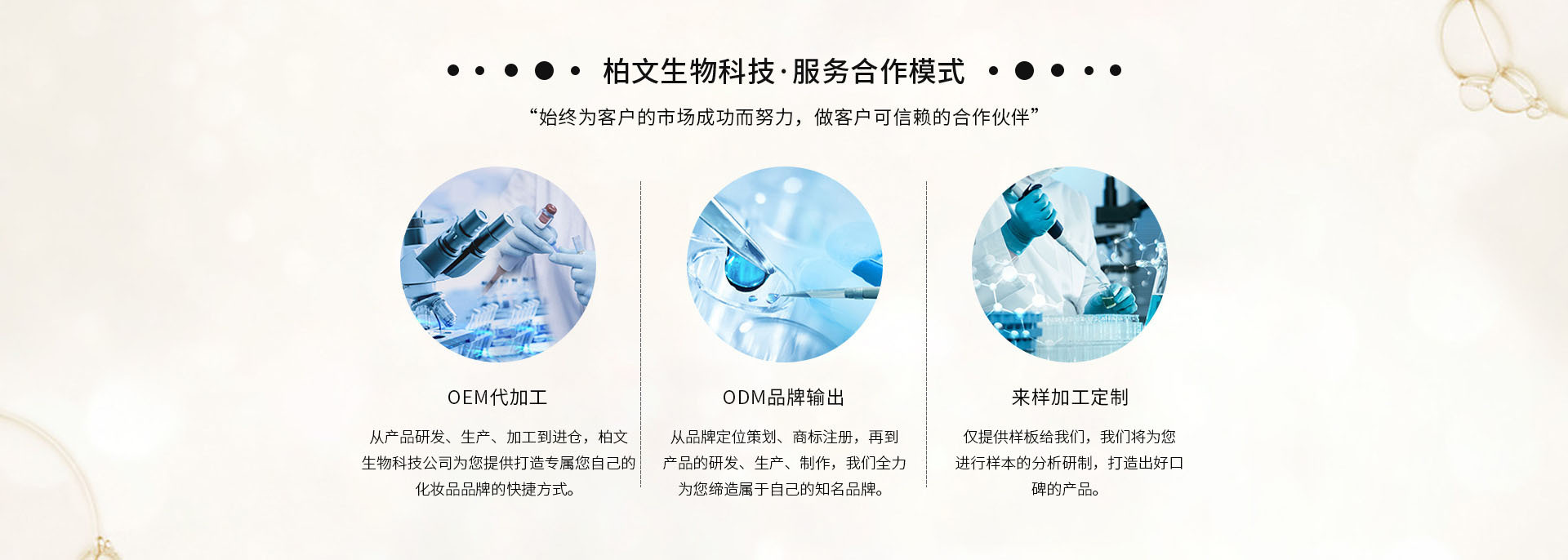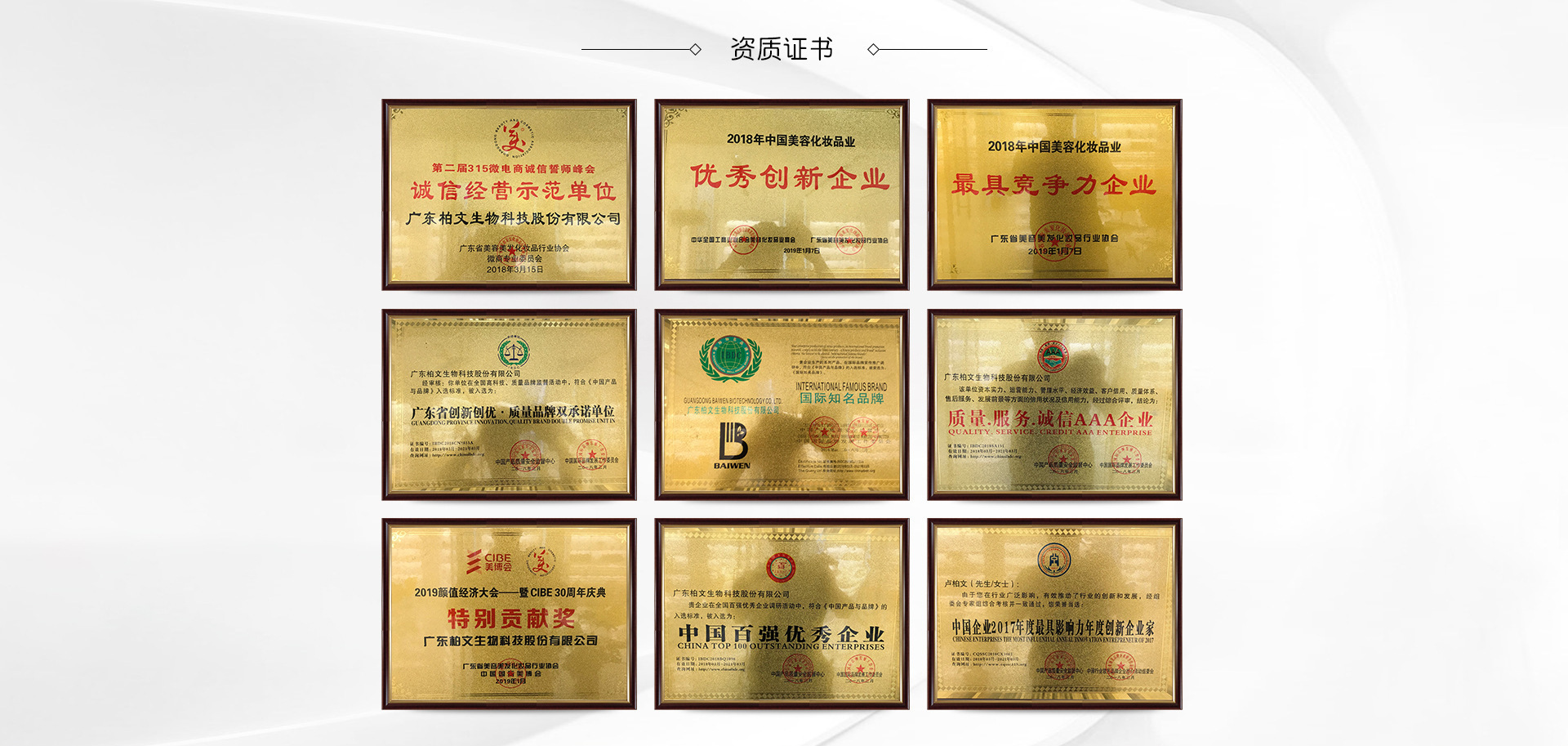 廣東柏文生物科技股份有限公司成立于2013年,總部位于中國廣州。致力于中國護膚健康美妝新零售品牌提供生產代加工與品牌咨詢服務。 作為資深的OEM/ODM服務提供商,廣東柏文股份擁有國際化、專業化、系統化的強大資源,旗下控股國內一流的護膚工廠、彩妝工廠、食品工廠、包材工廠、印刷工廠、原料供應,使我們從技術研發、生產運作、質量管理到原料供應、包材采購等每一個環節都具備自有的供應鏈,保證生產任務順利完成。新落成的廣州花都工廠,是集專業生產與媒體屬性于一身的創新型工廠:擁有16條先進的灌裝生產流?線、德國進口的乳化設備與空?壓縮機、意?利三級反滲透純?裝置、10萬級的?無菌凈化生產車間等。所有產品均通過世界權威機構檢測及國家食品藥品監督管理局備案,產品安全有效、品質可靠有保障。廣東柏文股份強大的硬件設施與專業的生產人才構成我們國際級的現代化生產體系,我們為客戶提供高效率、高品質、高標準的OEM/O