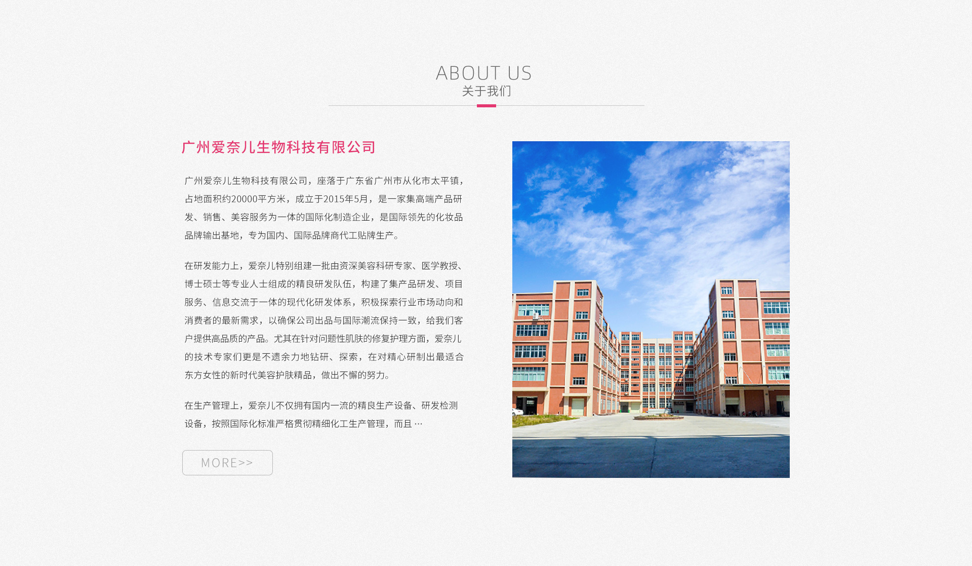 廣州愛(ài)奈兒生物科技有限公司,座落于廣東省廣州市從化市太平鎮(zhèn),占地面積約20000平方米,成立于2015年5月,是一家集高端產(chǎn)品研發(fā)、銷(xiāo)售、美容服務(wù)為一體的國(guó)際化制造企業(yè),是國(guó)際領(lǐng)先的化妝品品牌輸出基地,專為國(guó)內(nèi)、國(guó)際品牌商代工貼牌生產(chǎn)。 在研發(fā)能力上,愛(ài)奈兒特別組建一批由資深美容科研專家、醫(yī)學(xué)教授、博士碩士等專業(yè)人士組成的精良研發(fā)隊(duì)伍,構(gòu)建了集產(chǎn)品研發(fā)、項(xiàng)目服務(wù)、信息交流于一體的現(xiàn)代化研發(fā)體系,積極探索行業(yè)市場(chǎng)動(dòng)向和消費(fèi)者的最新需求,以確保公司出品與國(guó)際潮流保持一致,給我們客戶提供高品質(zhì)的產(chǎn)品。尤其在針對(duì)問(wèn)題性肌膚的修復(fù)護(hù)理方面,愛(ài)奈兒的技術(shù)專家們更是不遺余力地鉆研、探索,在對(duì)精心研制出最適合東方女性的新時(shí)代美容護(hù)膚精品,做出不懈的努力。