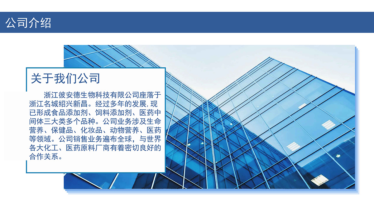 江彼安德生物科技有限公司座落于浙江名城紹興新昌。經(jīng)過多年的發(fā)展,現(xiàn)已形成食品添加劑、飼料添加劑、醫(yī)藥中間體三大類多個品種。公司業(yè)務涉及生命營養(yǎng)、保健品、化妝品、動物營養(yǎng)、醫(yī)藥等領域。公司銷售業(yè)務遍布全球,與世界各大化工、醫(yī)藥原料廠商有著密切良好的合作關系。