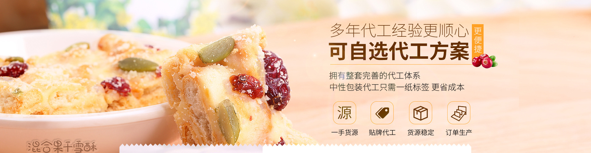 代工品類(lèi):麥片 梅類(lèi) 威化 西式糕點(diǎn) 夾心餅干 待煮面條 傳統(tǒng)糕點(diǎn) 山楂制品 硬糖 雞肉零食 餅干 其他固態(tài)乳制