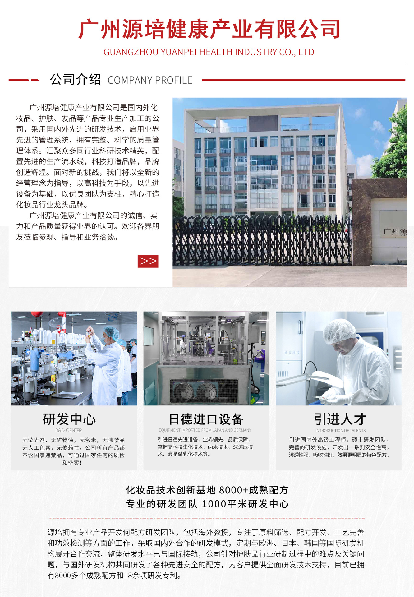 廣州源培健康產(chǎn)業(yè)有限公司是國內(nèi)外化妝品、護(hù)膚、發(fā)品等產(chǎn)品專業(yè)生產(chǎn)加工的公司,采用國內(nèi)外先進(jìn)的研發(fā)技術(shù),啟用業(yè)界先進(jìn)的管理系統(tǒng),擁有完整、科學(xué)的質(zhì)量管理體系。匯聚眾多同行業(yè)科研技術(shù)精英,配置先進(jìn)的生產(chǎn)流水線,科技打造品牌,品牌創(chuàng)造輝煌。面對新的挑戰(zhàn),我們將以全新的經(jīng)營理念為指導(dǎo),以高科技為手段,以先進(jìn)設(shè)備為基礎(chǔ),以優(yōu)良團(tuán)隊(duì)為支柱,精心打造化妝品行業(yè)龍頭品牌。廣州源培健康產(chǎn)業(yè)有限公司的誠信、實(shí)力和產(chǎn)品質(zhì)量獲得業(yè)界的認(rèn)可。歡迎各界朋友蒞臨參觀、指導(dǎo)和業(yè)務(wù)洽談。