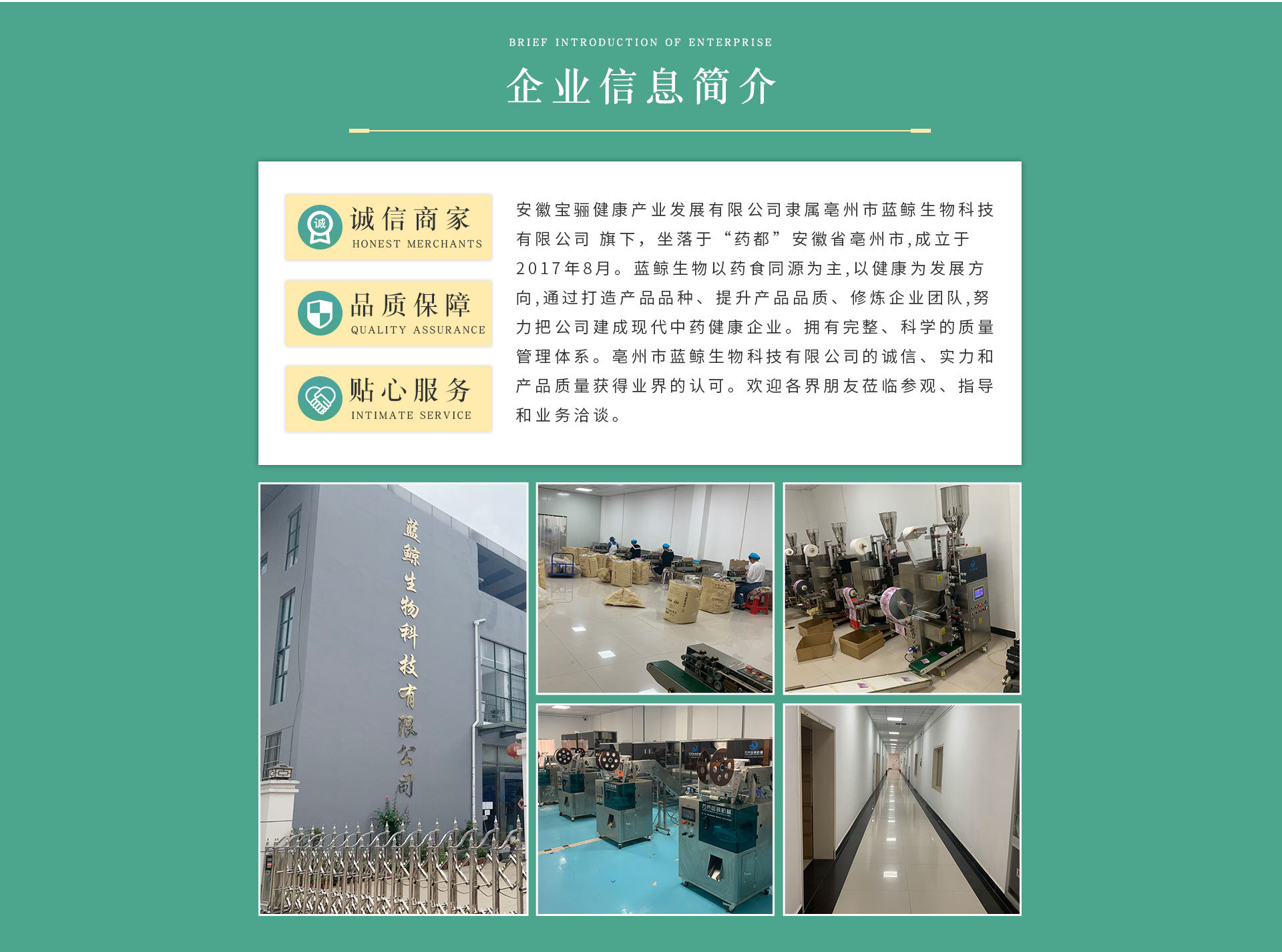 安徽寶驪健康產業發展有限公司隸屬亳州市藍鯨生物科技有限公司 旗下,坐落于“藥都”安徽省亳州市,成立于2017年8月。藍鯨生物以藥食同源為主,以健康為發展方向,通過打造產品品種、提升產品品質、修煉企業團隊,努力把公司建成現代中藥健康企業。擁有完整、科學的質量管理體系。亳州市藍鯨生物科技有限公司的誠信、實力和產品質量獲得業界的認可。歡迎各界朋友蒞臨參觀、指導和業務洽談