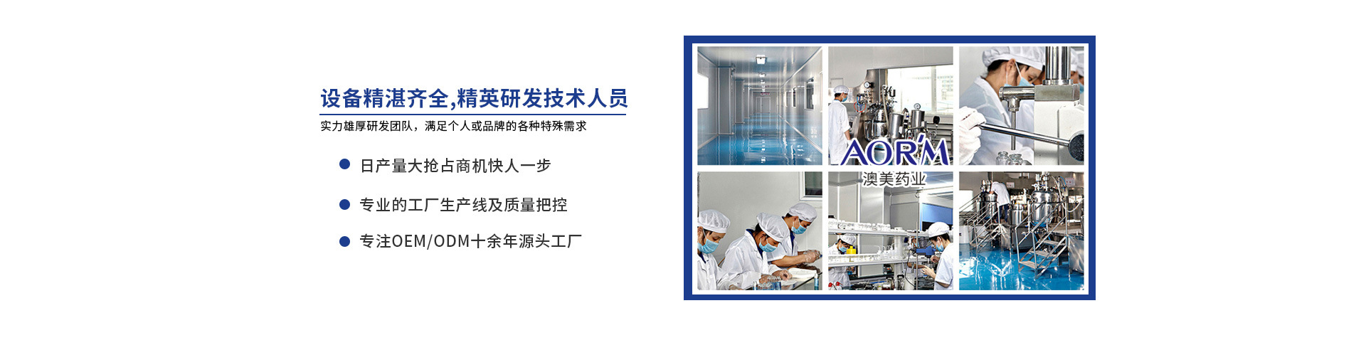 廣東澳美藥業(yè)有限公司,是一家擁有十多年集研發(fā)、設計、制造經驗于一體的專業(yè)OEM/ODM大型企業(yè)。注冊資金500萬,工廠建筑面積超8000多平方米,按照GMPC標準建立10萬級無塵車間,擁有生產線12條。秉承“求索進取,潤澤眾生”的理念,沿著“創(chuàng)新為民、高質惠民”的道路不懈追求。自創(chuàng)建以來,時刻保持追求卓越管控品質,邁向國際化企業(yè)為目標,不斷加快科技創(chuàng)新、自主品牌建設步伐,打造企業(yè)核心競爭力,努力實現“引領生物制藥發(fā)展,打造健康事業(yè)強者”的宏偉愿景。熱烈歡迎國內外客戶蒞臨參觀、指導和業(yè)務洽談。