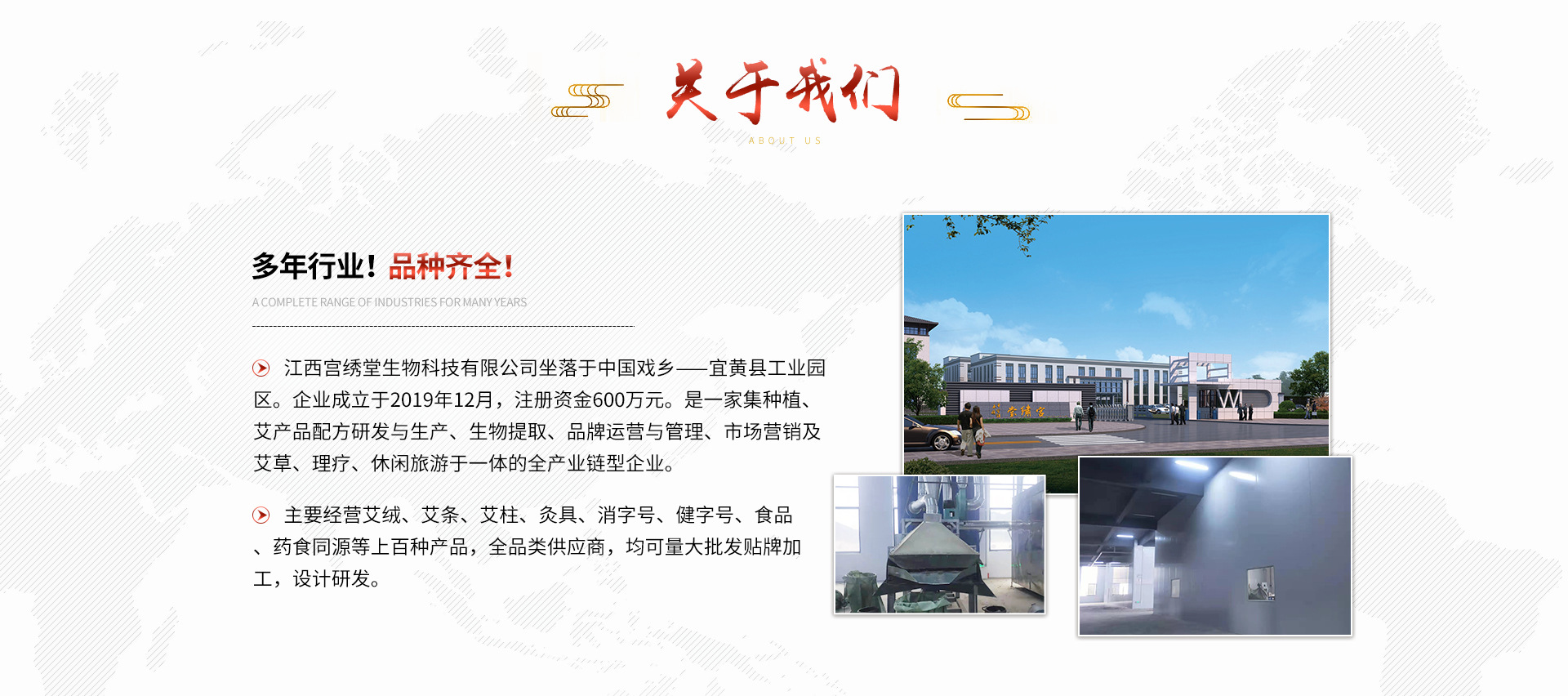 江西宮繡堂生物科技有限公司坐落于中國戲鄉宜黃縣工業因 區。企業成立于2019年12月,注冊資金是600萬元。是一家無公害集種植、艾產品配方研發與生產、生物提取、品牌運營與管理、市場營銷及艾草養生、理療、休閑旅游于一體的全產業鏈健康養生型企業。公司致力于深度挖掘江西十大名醫“黃宮繡:的文化價值和市場價值,為了打造艾草市場知名品牌,宮繡堂采用“公司十基地十農戶”:三位一體原料供應模式,為全國艾草生產企業提供優質的艾草原材料,匯集專家團隊研發優質的艾產品,開設宮繡堂連鎖艾灸養生館,并向大眾市場推廣,為民眾和患者提供優質的艾灸系列產品和艾灸館加盟及艾制品代理,讓傳承幾千年的艾灸文化普惠大眾。促進艾草產業經濟發展和國民身體健康、提高民眾生活幸福指數。