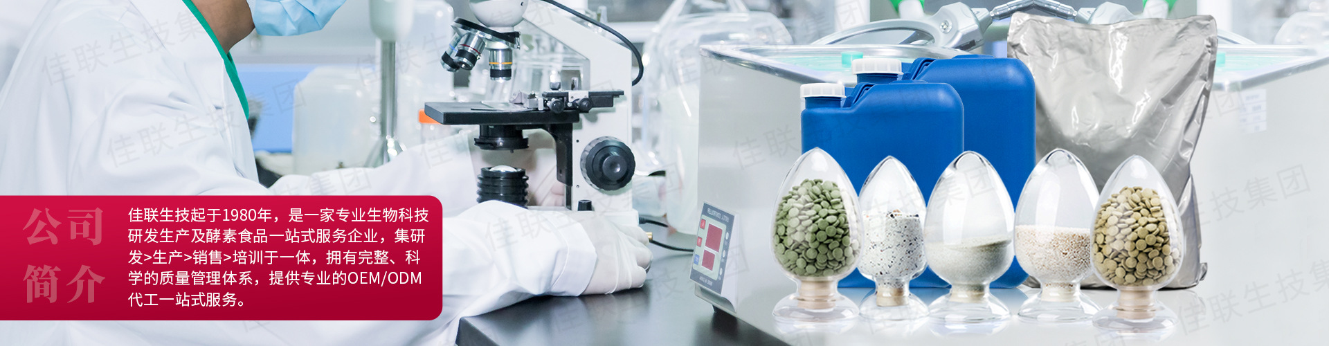 惠州嘉聯生物科技開發有限公司是一家以酵素研發、生產、銷售于一體的大型工廠,是隸屬佳聯生技集團旗下的一家專業酵素研發生產工廠。佳聯創立于1980年,目前有1個研發中心、2個事業總部、5大生產工廠。提供專業的OEM一站式服務,產品有酵素系列(原料供應、復合酵素液、酵素粉錠、酵素飲)、營養膳食餐包、益生菌產品等健康食品,根據客戶的需求,透過佳聯整合創新能力,提供客戶從產品設計、研發、生產、品管、包裝設計與視覺呈現、出倉、專業培訓及進出口服務等全方位服務。現代科技進步與發達,很多人忙于工作忽略營養和保養的重要性,佳聯生技不斷創新與研發更高效的健康食品,并提供完整的健康生活解決方案。通過產品+健康生活方式,結合傳統和現代網絡平臺傳遞,實現以“為現代人擁有健康身體、改善生活品質”的重要目標。