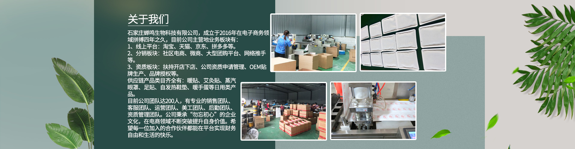 石家莊蟬鳴生物科技有限公司是一家從事保健產品和自發熱產品、艾灸貼、蒸汽眼罩等產品研發、生產、銷售于一體高科技企業,公司自有品牌“火火蟬”。 成立于2016年,支持OEM/ODM服務,可加工定制不同尺寸、型號的各類產品!公司依靠專業的研發生產技術為客戶提供品質優良、性價比更高的產品和更快速周到的服務,與多家生產廠家建立了良好的合作關系,日產暖貼100萬貼以上,深受國內外客戶好評。產品遠銷香港、臺灣、澳大利亞、美國、英國、俄羅斯、日本、韓國等多個國家地區。