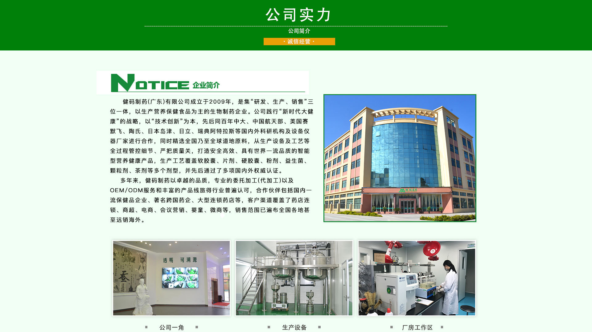 健碼制藥(廣東)有限公司,位于廣東省廣州市,成立于2009年,是一家集“研發(fā)、生產(chǎn)、銷售”三位一體,以生產(chǎn)營養(yǎng)保健食品為主的生物制藥企業(yè)。踐行“新時代大健康”的戰(zhàn)略,以“技術(shù)創(chuàng)新”為本,先后同百年中大、中國航天部、美國賽默飛、陶氏、日本島津、日立、瑞典阿特拉斯等國內(nèi)外科研機(jī)構(gòu)及設(shè)備儀器廠家進(jìn)行合作,同時精選全國乃至全球道地原料,從生產(chǎn)設(shè)備及工藝等全過程管控細(xì)節(jié)、嚴(yán)把質(zhì)量關(guān),打造安全高效、具有一流卓越品質(zhì)的智能型營養(yǎng)健康產(chǎn)品,生產(chǎn)工藝覆蓋軟膠囊、片劑、硬膠囊、粉劑、益生菌、顆粒劑、 茶劑等多個劑型,并先后通過了多 項(xiàng)國內(nèi)外權(quán)威認(rèn)證。
