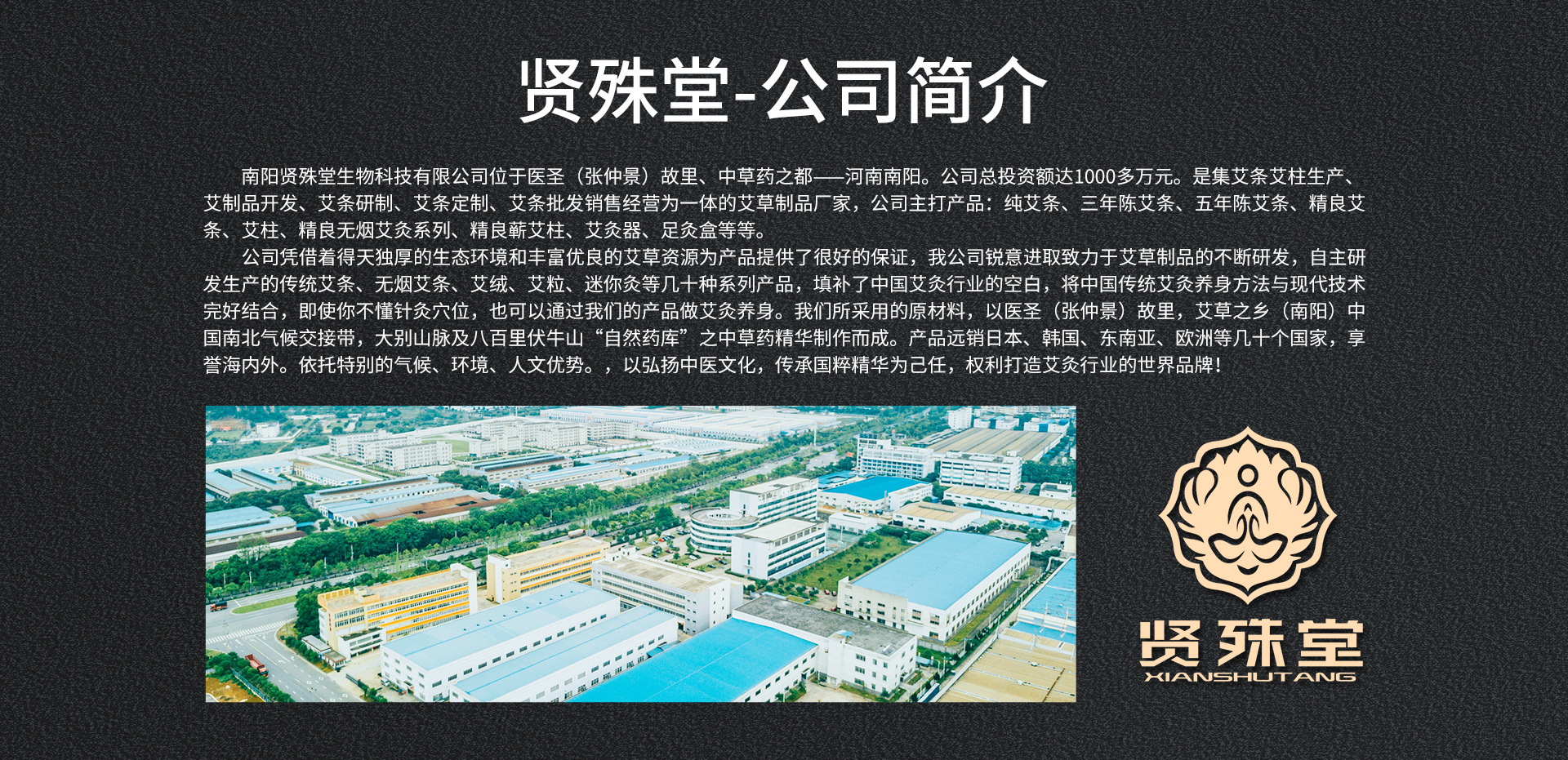南陽賢殊堂艾草制品有限公司位于醫圣(張伸景)故里、中草藥之都----河南南陽。公司總投資額達1000多萬元,是集艾條艾柱生產、艾制品開發、艾條研制、艾條定制、艾條批發銷售經營為一體的艾條廠家,公司主打產品,純艾條,三年陳艾條,五年陳艾條,精品艾條,艾柱,精品無煙艾條系列,精品薪艾柱,艾灸器,足灸盒等等,素有“艾草之鄉”之稱。 公司憑借著得天獨厚的生態環境和豐富優質的艾草資源為產品提供了最優質的保證,我公司銳意進取致力于艾草制品的不斷研發,自主研發生產的傳統艾條,無煙艾條,艾絨、艾粒、迷你灸等近幾十種系列產品,填補了中國艾灸行業的空白,將中國傳統艾灸養生秘方與現代技術完美結合,即使你不懂針灸穴位,也可以通過我們的產品做艾灸養生。我們所采用的原材料,以精選醫圣(張仲景)故里,藥材之都(南陽)中國南北氣候交接帶,大別山脈及八百里伏牛山“天然藥庫”之中草藥精華精制而成。