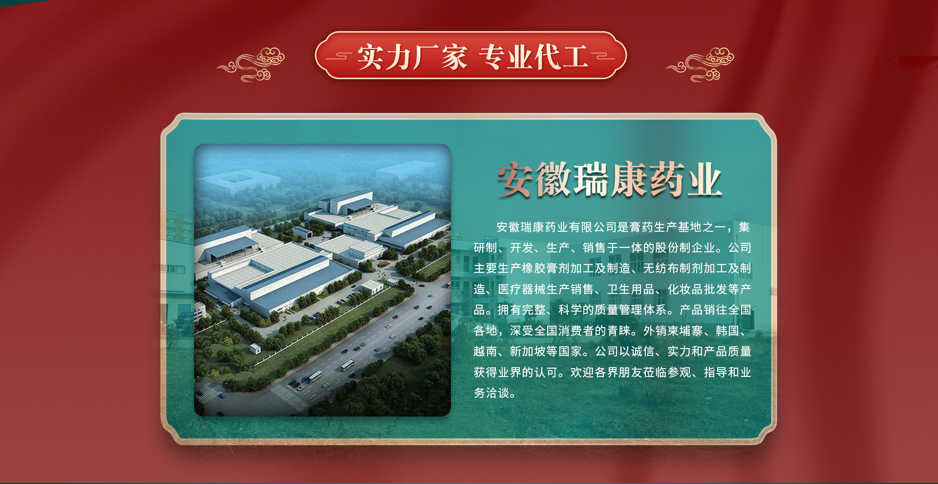 安徽瑞康藥業(yè)有限公司是膏藥生產(chǎn)基地之一,集研制、開發(fā)、生產(chǎn)、銷售于一體的股份制企業(yè)。公司主要生產(chǎn)有:醫(yī)療器械類(遠(yuǎn)紅外系列貼劑、自行發(fā)熱貼系列)、衛(wèi)生用品類等。產(chǎn)品銷往全國各地,深受全國消費者的青睞。外銷柬埔寨、韓國、越南、新加坡等國家。隨著中國中醫(yī)藥學(xué)科技的發(fā)展,近年來,公司在不斷改革創(chuàng)新,嚴(yán)格按照生產(chǎn)工藝、科學(xué)配方。堅持發(fā)揚“同心、開拓、求實、高效”的企業(yè)精神。明確實事求是、穩(wěn)步增長的企業(yè)發(fā)展思路。在全體職工的共同努力下,積極開拓、不斷進取,現(xiàn)已發(fā)展成為具有現(xiàn)代化專業(yè)流水線生產(chǎn)二類醫(yī)療器械(遠(yuǎn)紅外貼劑)的企業(yè)。 安徽瑞康藥業(yè)有限公司是橡膠膏劑加工及制造、無紡布制劑加工及制造、醫(yī)療器械生產(chǎn)銷售、衛(wèi)生用品、化妝品批發(fā)等產(chǎn)品專業(yè)生產(chǎn)加工的公司,擁有完整、科學(xué)的質(zhì)量管理體系。 安徽瑞康藥業(yè)有限公司的誠信、實力和產(chǎn)品質(zhì)量獲得業(yè)界的認(rèn)可。歡迎各界朋友蒞臨參觀、指導(dǎo)和業(yè)務(wù)洽談。