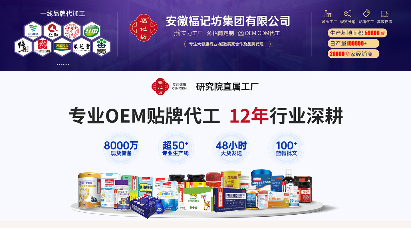 福記坊核心優(yōu)勢:30 高級研發(fā)人才、32類產品種類、800 可生產產品、45000㎡自主生產車間、30000㎡無菌標準車間、2000 經銷商、3.6萬㎡生產基地、30 進口生產線、10萬 日產量、10萬級凈化車間、100 國食健字批文、100 食健字批文、10余所研發(fā)合作大學(徽中醫(yī)藥大學、中國中醫(yī)科學院等大學),企業(yè)員工300 。 福記坊承接貼牌代加工,合作品牌:仁和,同仁堂,廣藥白云山,修正,江中等。