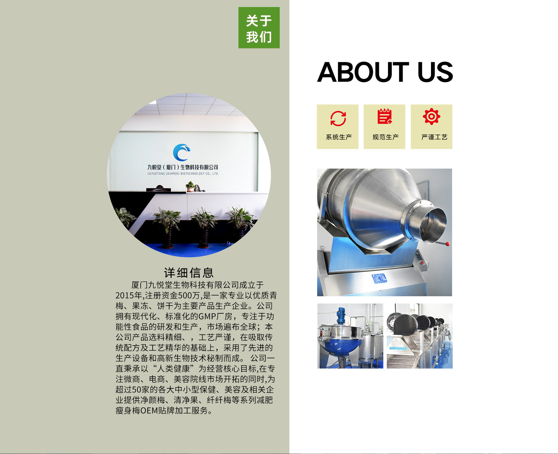 九悅堂(廈門)生物科技有限公司是酵素果凍、酵素粉、酵素青梅、代餐粉、代餐餅干等產品專業生產加工的公司,擁有完整、科學的質量管理體系。九悅堂(廈門)生物科技有限公司的誠信、實力和產品質量獲得業界的認可。歡迎各界朋友蒞臨參觀、指導和業務洽談。
