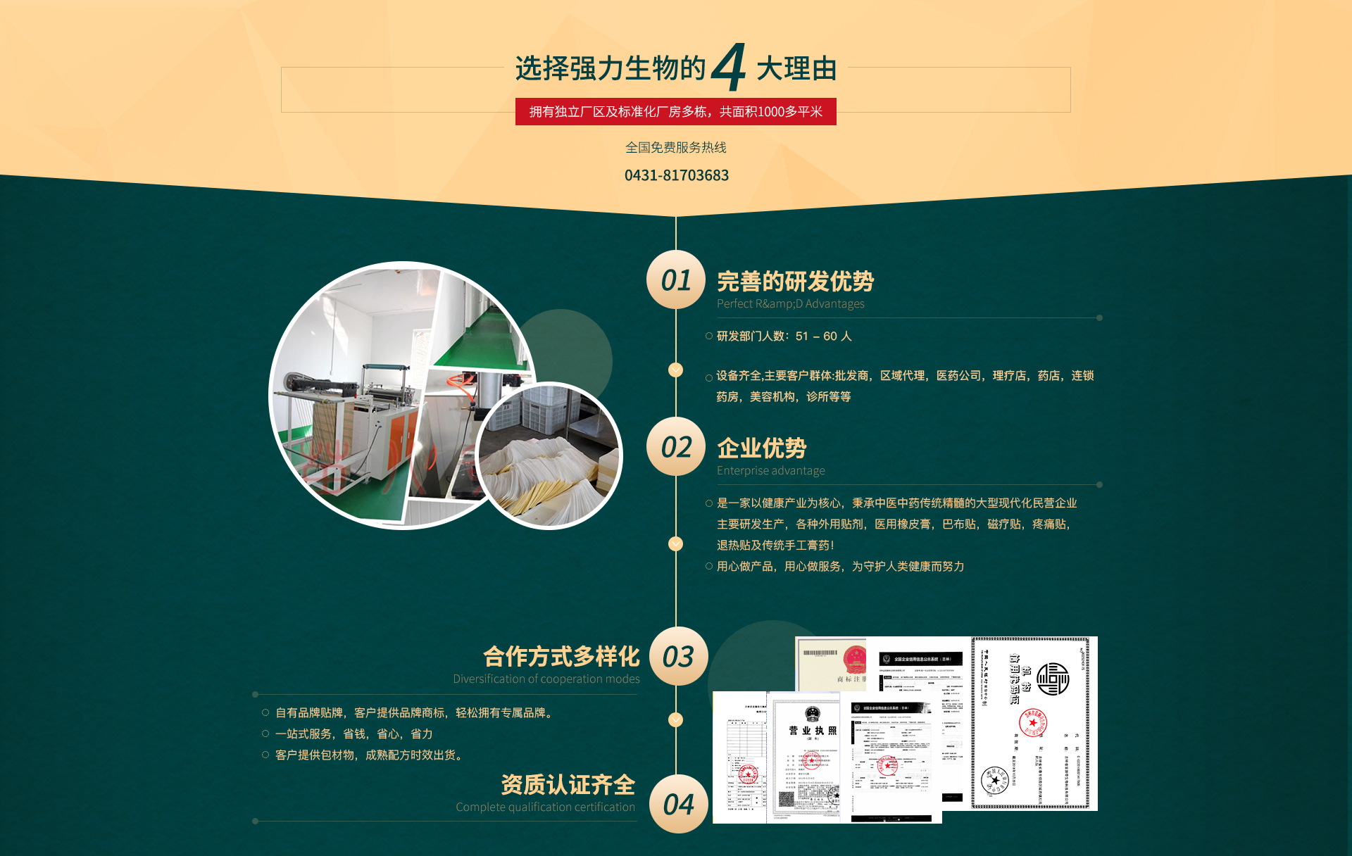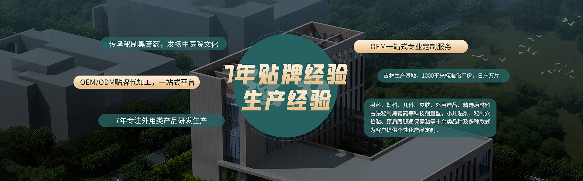 吉林省強力生物科技有限公司多年來整理結合苗藥和北藥的經典驗方,是致力于苗藥貼劑和東北傳統手工膏藥科研,開發生產,銷售為一體的高科技企業,專注于醫用新材料的外用貼劑的研發,定制,銷售,服務全球市場,以OEM加工、批發為主,致力于打造貼劑產品高端品牌