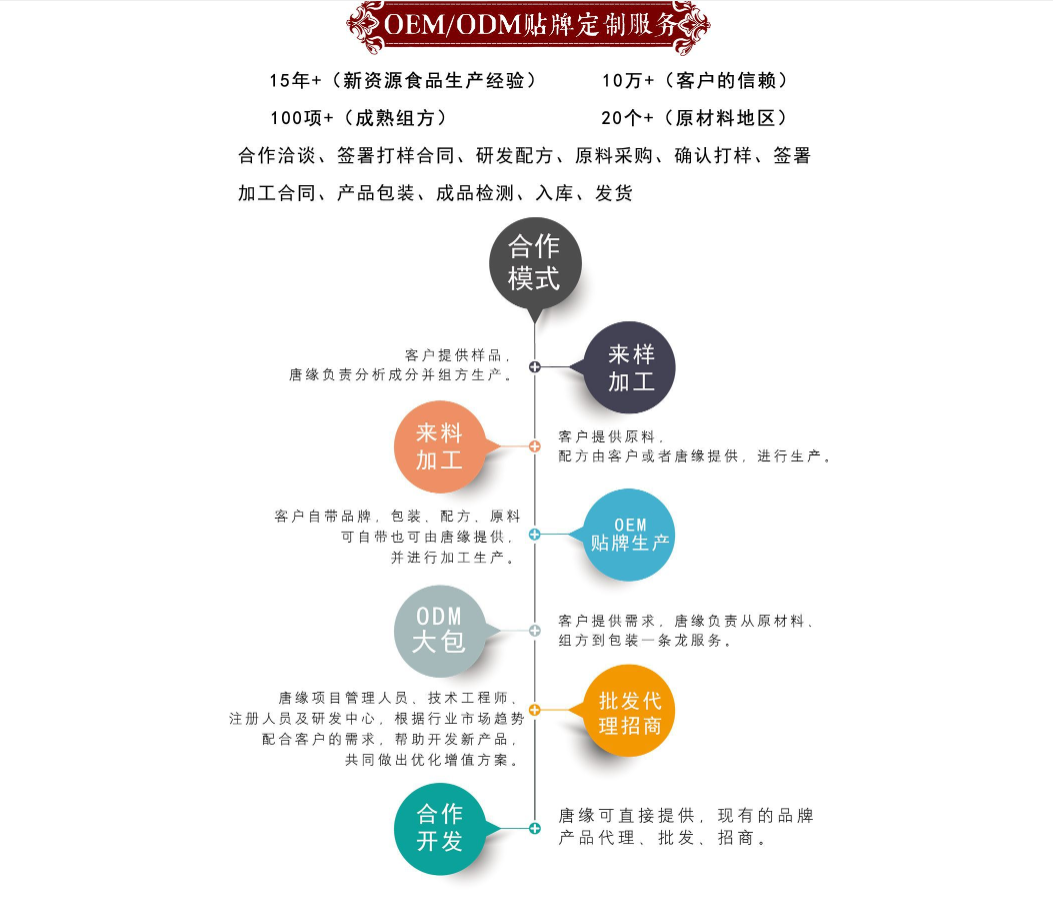 湖北唐緣生物醫藥科技有限公司坐落于“九省通衢” 的武漢。是一家集產品研發、生產、營銷、銷售為一體的 大健康全產業鏈綜合服務平臺。旗下擁有湖北唐緣生物醫 藥科技有限公司、武漢二活堂生物工程有限公司、湖北浩 揚醫藥科技有限公司。 公司先后通過國家保健食品認證、食品生產許可SC 認證,擁有45000平米的高標準化潔凈廠房、30米的高規 格實驗室、多個大型原材料植基地和發酵基地、國內外優 質原材料供應商。產品體系涵蓋膏方/膏滋、飲料濃漿、 固體飲料、壓片糖果、袋泡茶、丸劑,六大劑型,現已有特 膳食品、新資源食品食品300余種。產品質量、銷量、生 產規模、產能、產量居全國同類企業領先水平。作為中國 百家知名企業指定服務商,在業內久負盛名,建立了良好口 碑和卓越商譽。